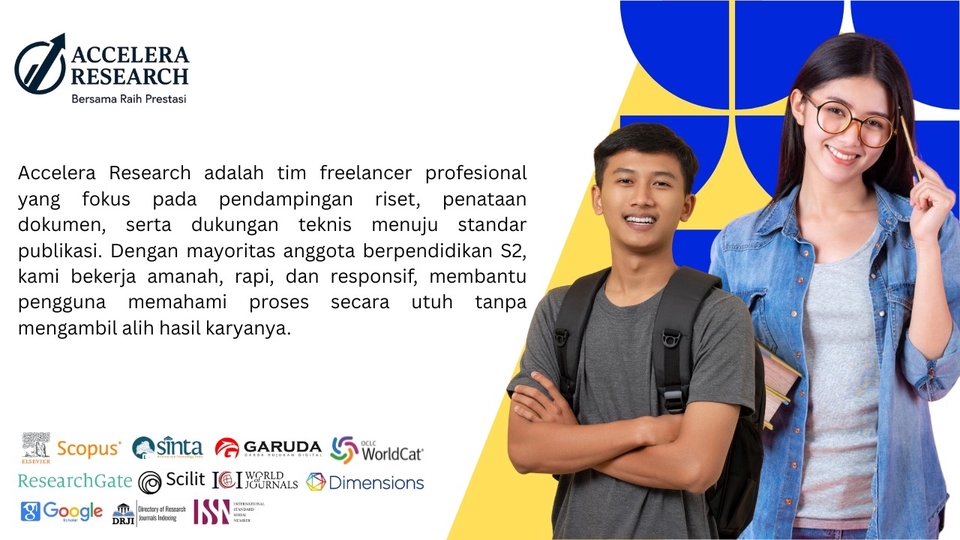 Accelera Research – “Bersama Raih Prestasi” adalah tim freelancer profesional yang fokus pada pendampingan riset, penataan dokumen, serta dukungan teknis menuju standar publikasi. Dengan mayoritas anggota berpendidikan S2, kami bekerja amanah, rapi, dan responsif, membantu pengguna memahami proses secara utuh tanpa mengambil alih hasil karyanya.