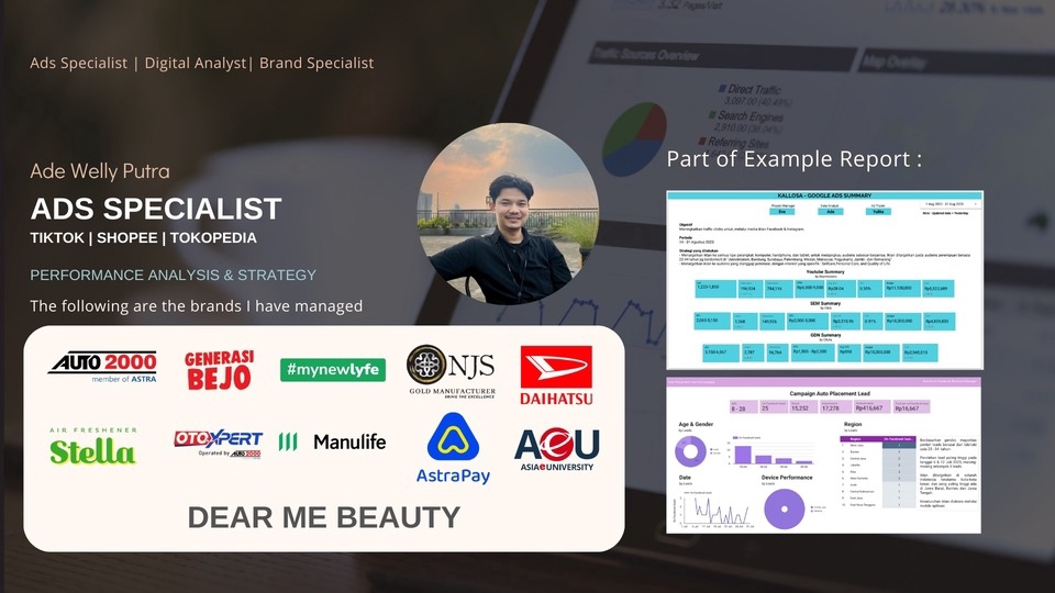 Saya seorang profesional Digital Marketing dengan pengalaman 3 tahun di bidang Performance Ads, Digital Brand Analysis, dan Social Media Strategy. Berpengalaman dalam mengelola TikTok Ads, Shopee Ads, dan Tokopedia Ads untuk meningkatkan penjualan melalui campaign seperti GMV Max, Banner Ads, Live Ads, serta campaign ads lainnya. 1. Diskusi kebutuhan dan tujuan campaign (sales, awareness, traffic) 2. Menentukan target audiens, budget, dan durasi iklan 3. Membuat dan mengatur campaign di TikTok Ads / Shopee Ads 4. Monitoring performa iklan harian & optimasi hasil 5. Membuat laporan performa akhir + rekomendasi strategi berikutnya