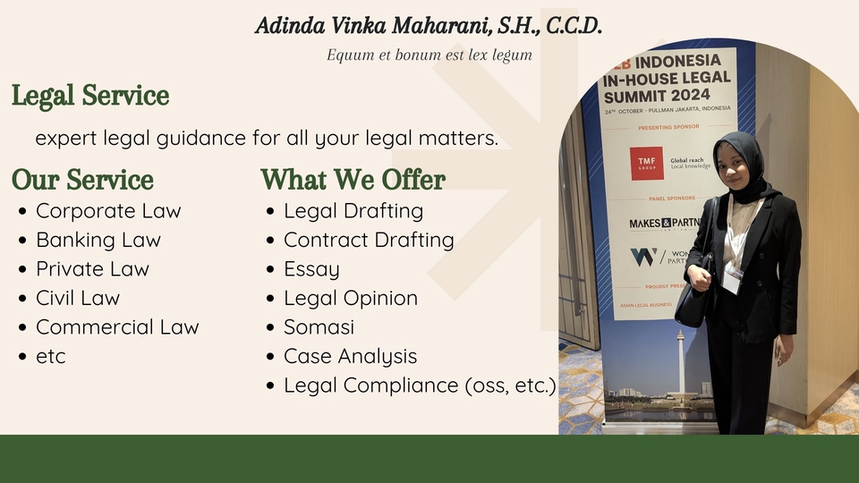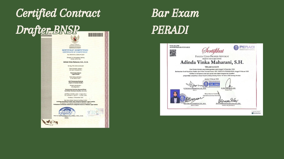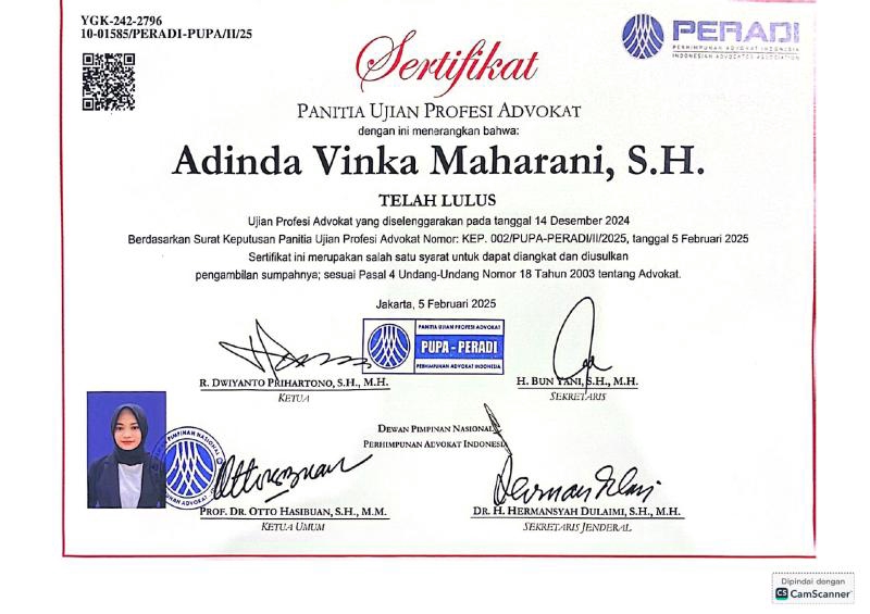 Adinda merupakan seorang lulusan Fakultas Hukum Universitas Sebelas Maret Surakarta yang saat ini berprofesi sebagai Junior Legal Counsel pada salah satu start-up industri peternakan. Ia telah mengikuti beberapa pendidikan dan sertifikasi seperti Pendidikan Khusus Profesi Advokat (PKPA) yang diselenggarakan oleh Perhimpunan Advokat Indonesia (PERADI) bersama dengan Fakultas Hukum Universitas Islam Indonesia dan Pelatihan Legal Drafting dan Sertifikasi Ahli Perancangan Kontrak yang diseenggarakan oleh Jimly School of Law and Government. Selama masa perkuliahan, Adinda berpartisipasi dalam 9 kompetisi di bidang hukum bisnis dan 6 di antaranya ia memperoleh penghargaan. Selama bekerja dan magang, Adinda memiliki beberapa pengalaman yakni: 1. Pendaftaran Nomor Induk Berusaha (NIB); 2. Pendaftaran Merek; 3. Pendaftaran Nomor Pokok Wajib Pajak (NPWP); 4. Perjanjian Kerja Sama; 5. Pengoperasian Online Single Submission (OSS RBA); 6. Pendaftaram, Pengubahan, Pencabutan Klasifikasi Baku Lapangan Usaha Indonesia (KBLI 2020); 7. Non-Disclosure Agreement (NDA); 8. Review Perjanjian; 9. Legal Opinion; 10. Dokumen Hukum (Gugatan, Replik, Duplik, dll.) 11. Legal Consultant. Langkah Pekerjaan 1. Konsultasi hukum atas permasalahan yang dialami Klien 2. Legal Opinion atas permasalahan yang dialami Klien 3. Feedback dari Klien