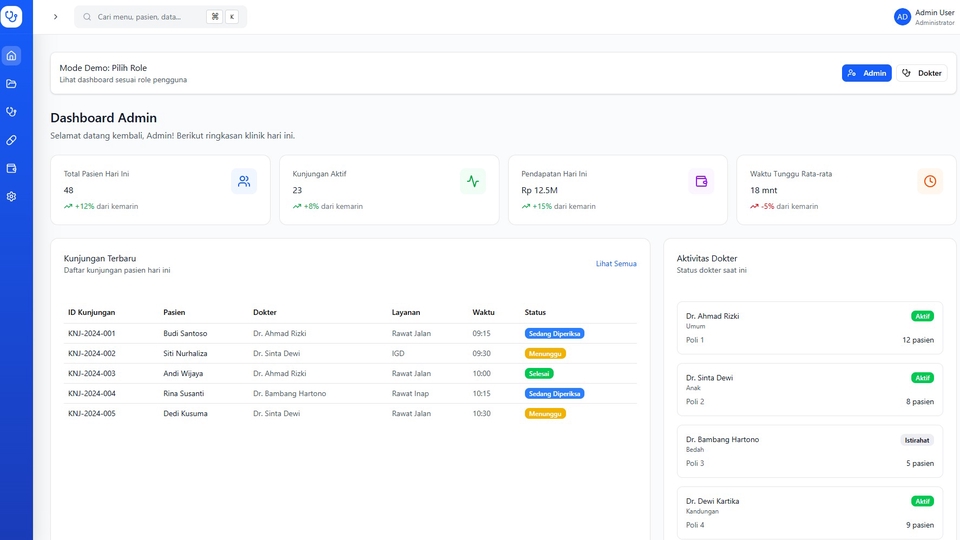 Fitur Utama 1. Manajemen Pasien & Pemeriksaan 2. Registrasi pasien (baru & lama) 3. Input & pemilihan jenis pemeriksaan 4. Tracking status pemeriksaan (Pending → Proses → Verifikasi → Selesai) 5. Input Hasil Laboratorium 6. Form input hasil otomatis sesuai jenis pemeriksaan 7. Nilai referensi otomatis 8. Flag abnormal (H/L) 9. Riwayat hasil pemeriksaan pasien 10. Upload lampiran hasil (PDF/Foto) Manajemen Parameter & Paket Pemeriksaan 1. CRUD parameter lab 2. Penentuan nilai normal berdasarkan usia, jenis kelamin 3. Pembuatan paket pemeriksaan (Lab Panel) Hak Akses & Keamanan 1. Multi-role (Admin, Petugas Lab, Analis, Kasir, Dokter) 2. Log aktivitas pengguna Backup data otomatis 1. Akses berbasis cloud Keunggulan Utama 100% berbasis web, dapat diakses dari PC, tablet, atau laptop Desain modern dan responsif Mengurangi human error pada input hasil Mempercepat proses pelayanan kepada pasien Siap digunakan untuk standar akreditasi laboratorium