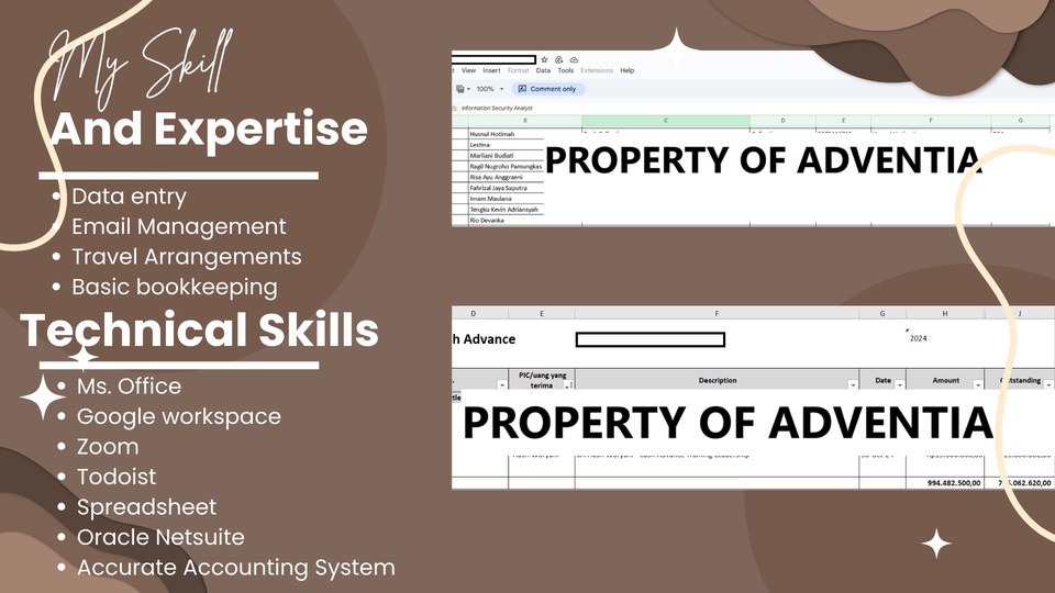 Hallo, Saya Adventia seorang Virtual Assistance dengan background Accounting selama 11 tahun. Saya punya pengalaman dalam bidang administrasi, dan juga finance. Saya bisa membantu dalam pekerjaan sebagai berikut: - Office administrative - Personal administrative - Travel arrangement - Email management - Data entry - Data conversion - Simple bookkeeping.