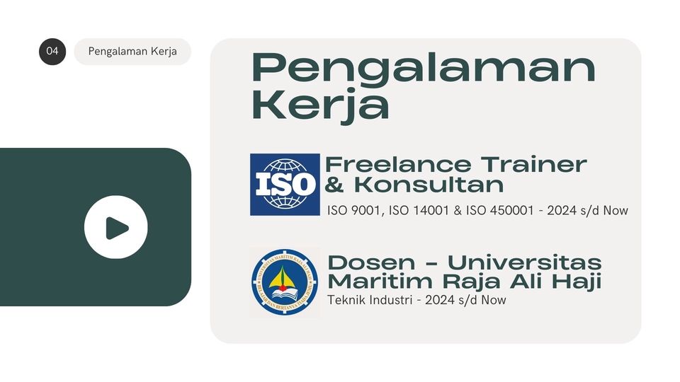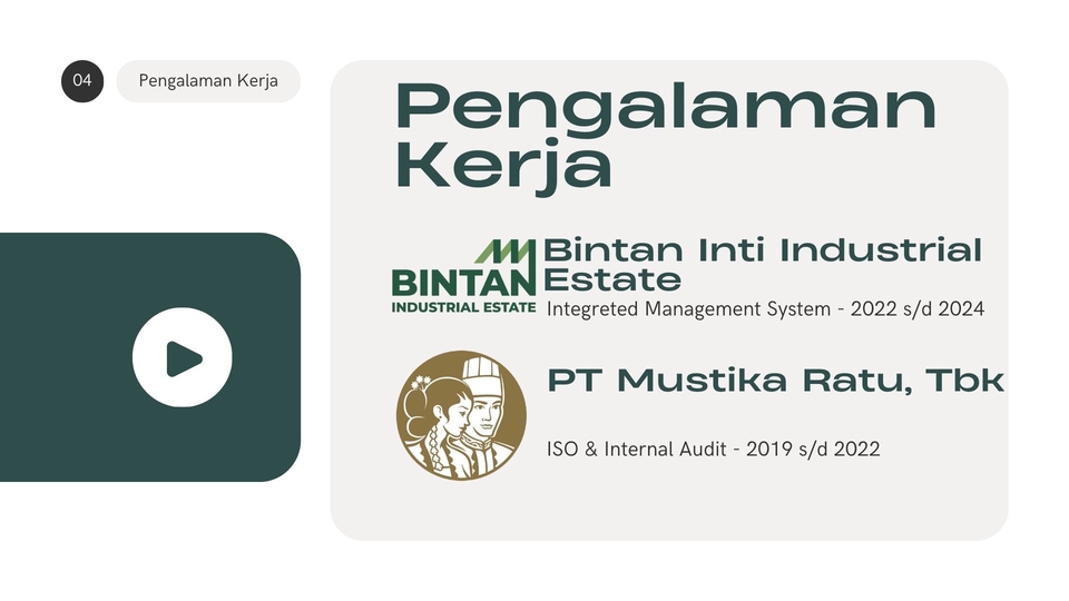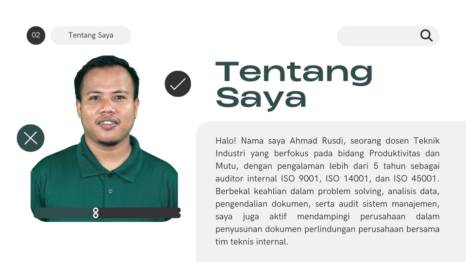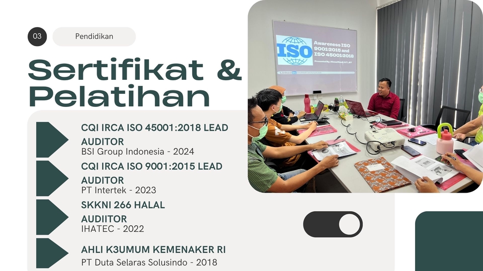 Spesialis Quality Assurance & ISO Konsultan dengan pengalaman lebih dari 5 tahun dalam sistem manajemen mutu, dokumentasi, dan audit internal. Terbiasa mengelola standar sertifikasi ISO, BPOM, UKL-UPL, dan SJPH. Berpengalaman menyusun dan mengendalikan dokumen mutu seperti SOP, WI, serta formulir pendukung. Teliti, detail-oriented, dan berkomitmen memastikan proses sesuai prosedur & regulasi.