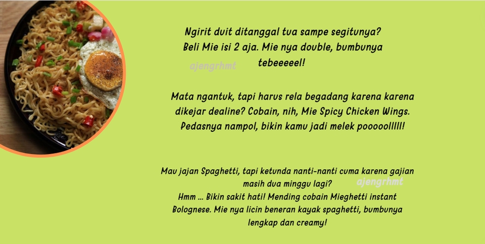 Halo, aku Ajeng. Buat kalian yang mau order jasa aku boleh banget, ya! Disini aku bisa membantu para UMKM yang berniat membuka usaha namun masih kesulitan untuk memasarkan produk, aku juga membantu tugas kalian jika diharuskan membuat cerpen dsb. Cara pengerjaan: 1. Perkenalkan sebuah produk yang akan dipasarkan 2. Beri briefing mau seperti apa pemasarannya nanti 3. Pengiriman bisa melalui dokumen atau pdf 4. Bisa revisi maksimal 2x 5. Bisa dadakan maksimal h-1 Langkah Pekerjaan 1. Memberikan contoh deskripsi produk dan target marketingnya 2. File dikirimkan melalui pdf atau dokumen