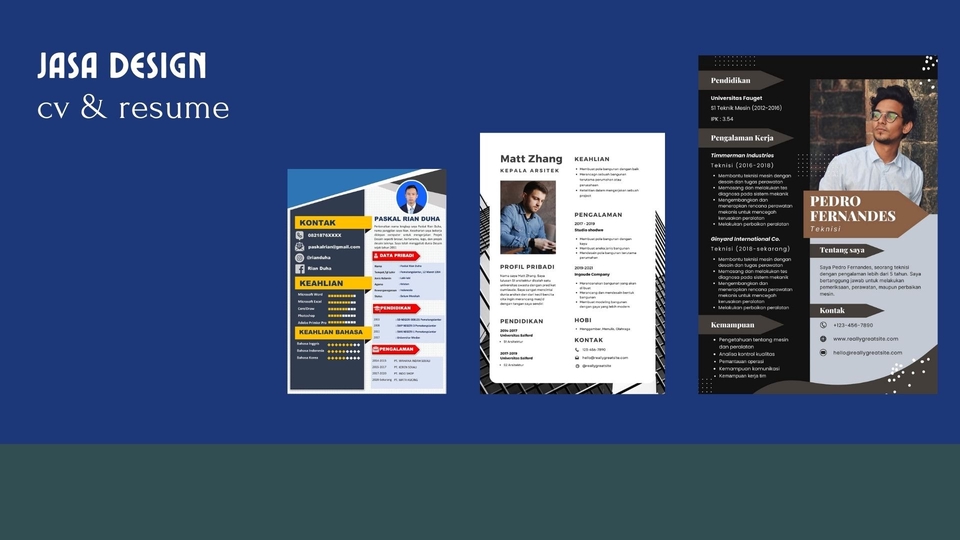 Harga murah dengan kualitas desain professional dengan hasil file high resolution. Semua template yang ditampilkan dan ditawarkan merupakan hasil desain menggunakan canva pro. Langkah Pekerjaan 1. Pelanggan menghubungi dan mengirimkan template desain yang sudah tertera 2. Pelanggan mengirimkan form data yang akan dimasukkan kedalam CV