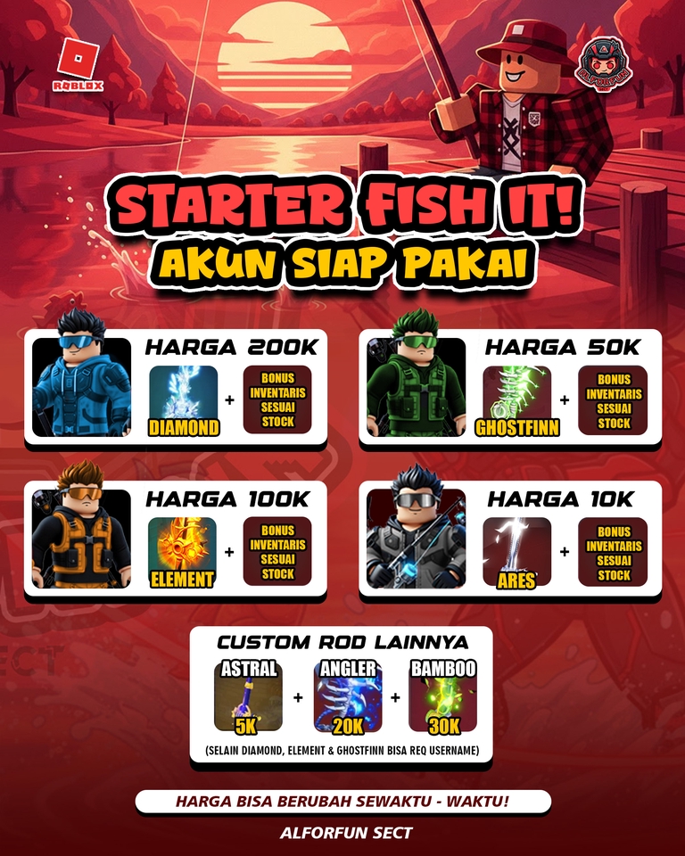 🔥 AKUN STARTER FISH IT ROBLOX — READY STOCK! 🔥 🎣 Mau langsung mancing tanpa grind capek? Cukup beli akun siap pakai, udah dapet Rod + Power Combo OP 💪 📦 Pilihan Akun Starter: 💖 Element + Corrup (Paling Powerfull) 💎 Ghostfinn + Corrup (Setup Viral Favorit) 💎 Angler + Corrup (balanced & cepat farming) ⚡ Ares + Corrup (effisiensi & stabil) 🔥 Custom Bobber (Pilih Bobber Favoritmu) ✨ Keunggulan: ✅ Akun fresh — langsung login & main ✅ Rod & item ready (no grind, no repot) ✅ Cocok buat kolektor & player baru ✅ Bisa request joki rod dan bobber juga di akunmu sendiri 💬 Stock terbatas, langsung PM sebelum kehabisan! 💰 Aman, cepat, dan trusted!