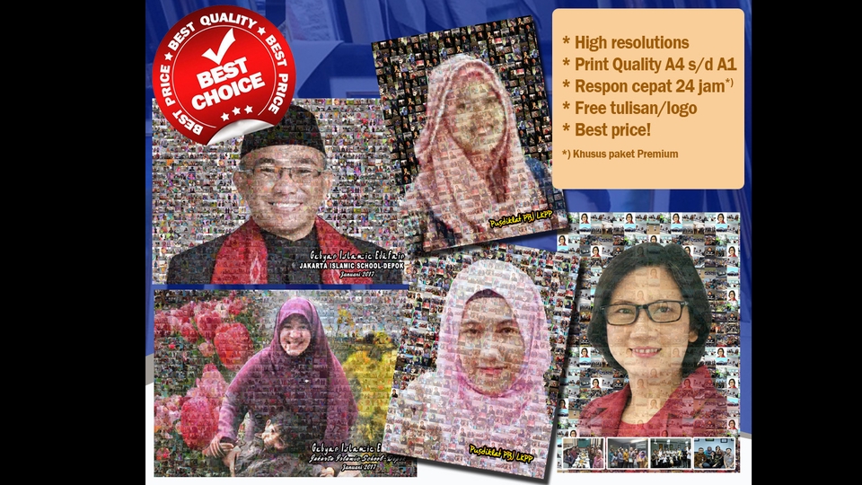 Rp50,0 rbDeskripsi harga Gambar Mosaic Foto Potrait (berdiri) maupun landscape (mendatar) Buyer akan mendapatkan: - File final highres format JPEG dan PDF - Revisi 3x - Free tulisan dan logo dari Buyer (Gambar logo mohon jelas)