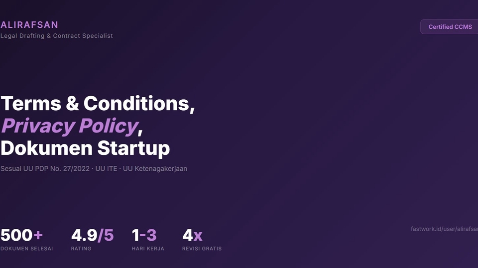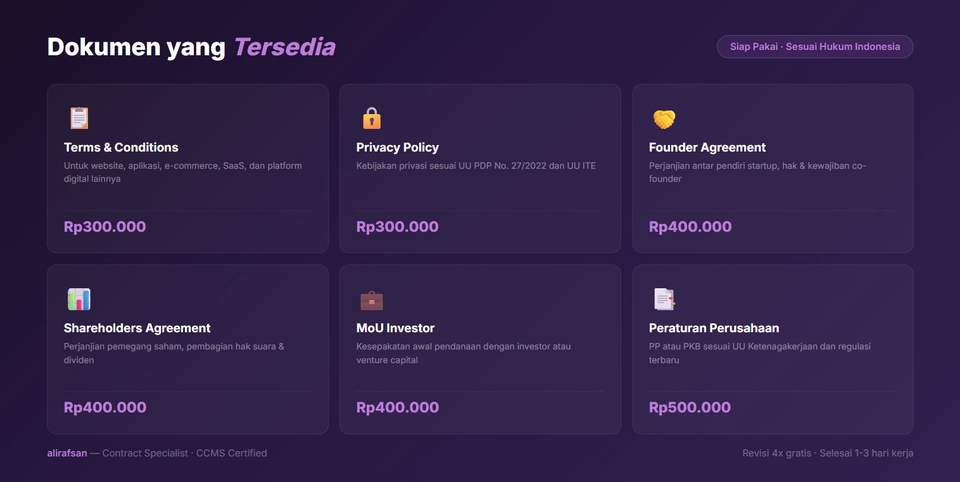Bisnis online Anda WAJIB punya Terms & Conditions dan Privacy Policy yang sesuai hukum Indonesia! Sejak berlakunya UU Pelindungan Data Pribadi (UU PDP No. 27/2022), setiap website, aplikasi, dan platform digital wajib memiliki kebijakan privasi yang sesuai regulasi. Pelanggaran dapat berujung pada sanksi administratif hingga pidana. Saya menyediakan jasa penyusunan dokumen legal untuk bisnis digital, startup, dan perusahaan yang membutuhkan dokumen hukum siap pakai, profesional, dan sesuai regulasi terbaru. Bersertifikat Certified Contract Management Specialist (CCMS) dengan pengalaman 7+ tahun dan telah menyelesaikan 500+ dokumen hukum. Dokumen yang Tersedia: 1. Terms & Conditions (T&C) Untuk website, aplikasi, e-commerce, SaaS, dan platform digital lainnya. Mengatur hak & kewajiban pengguna, batasan tanggung jawab, dan ketentuan penggunaan. 2. Privacy Policy / Kebijakan Privasi Sesuai UU PDP No. 27/2022 dan UU ITE. Mengatur pengumpulan, penyimpanan, pemrosesan, dan perlindungan data pribadi pengguna. 3. Dokumen Startup • Founder Agreement – perjanjian antar pendiri • Shareholders Agreement (SHA) – perjanjian pemegang saham • MoU Investor – kesepakatan awal dengan investor • Convertible Note / SAFE Agreement 4. Peraturan Perusahaan & PKB • Peraturan Perusahaan (PP) – sesuai UU Ketenagakerjaan • Perjanjian Kerja Bersama (PKB) – untuk perusahaan dengan serikat pekerja Keunggulan Layanan: ✅ Sesuai hukum Indonesia terbaru (UU PDP, UU ITE, UU Ketenagakerjaan) ✅ Bahasa hukum jelas dan mudah dipahami ✅ File dalam format Word & PDF yang rapi ✅ Estimasi pengerjaan 1–3 hari kerja ✅ Revisi hingga 4x gratis ✅ Bersertifikat CCMS Proses Kerja: 1. Kirimkan informasi tentang bisnis/platform Anda 2. Analisis kebutuhan & estimasi waktu 3. Draft dokumen disusun sesuai regulasi 4. Revisi sesuai masukan (hingga 4x) 5. Dokumen final siap pakai Klien yang Pernah Menggunakan Jasa Saya: • Pertamina International Shipping • PT Sony Indonesia • Pupuk Indonesia Logistik • Dan 100+ perusahaan lainnya
