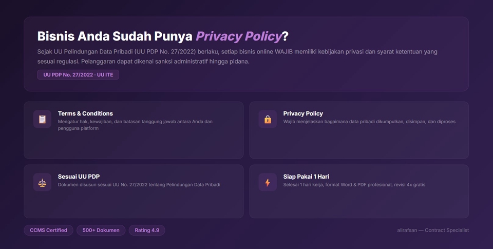 Bisnis online Anda WAJIB punya Terms & Conditions dan Privacy Policy yang sesuai hukum Indonesia! Sejak berlakunya UU Pelindungan Data Pribadi (UU PDP No. 27/2022), setiap website, aplikasi, dan platform digital wajib memiliki kebijakan privasi yang sesuai regulasi. Pelanggaran dapat berujung pada sanksi administratif hingga pidana. Saya menyediakan jasa penyusunan dokumen legal untuk bisnis digital, startup, dan perusahaan yang membutuhkan dokumen hukum siap pakai, profesional, dan sesuai regulasi terbaru. Bersertifikat Certified Contract Management Specialist (CCMS) dengan pengalaman 7+ tahun dan telah menyelesaikan 500+ dokumen hukum. Dokumen yang Tersedia: 1. Terms & Conditions (T&C) Untuk website, aplikasi, e-commerce, SaaS, dan platform digital lainnya. Mengatur hak & kewajiban pengguna, batasan tanggung jawab, dan ketentuan penggunaan. 2. Privacy Policy / Kebijakan Privasi Sesuai UU PDP No. 27/2022 dan UU ITE. Mengatur pengumpulan, penyimpanan, pemrosesan, dan perlindungan data pribadi pengguna. 3. Dokumen Startup • Founder Agreement – perjanjian antar pendiri • Shareholders Agreement (SHA) – perjanjian pemegang saham • MoU Investor – kesepakatan awal dengan investor • Convertible Note / SAFE Agreement 4. Peraturan Perusahaan & PKB • Peraturan Perusahaan (PP) – sesuai UU Ketenagakerjaan • Perjanjian Kerja Bersama (PKB) – untuk perusahaan dengan serikat pekerja Keunggulan Layanan: ✅ Sesuai hukum Indonesia terbaru (UU PDP, UU ITE, UU Ketenagakerjaan) ✅ Bahasa hukum jelas dan mudah dipahami ✅ File dalam format Word & PDF yang rapi ✅ Estimasi pengerjaan 1–3 hari kerja ✅ Revisi hingga 4x gratis ✅ Bersertifikat CCMS Proses Kerja: 1. Kirimkan informasi tentang bisnis/platform Anda 2. Analisis kebutuhan & estimasi waktu 3. Draft dokumen disusun sesuai regulasi 4. Revisi sesuai masukan (hingga 4x) 5. Dokumen final siap pakai Klien yang Pernah Menggunakan Jasa Saya: • Pertamina International Shipping • PT Sony Indonesia • Pupuk Indonesia Logistik • Dan 100+ perusahaan lainnya