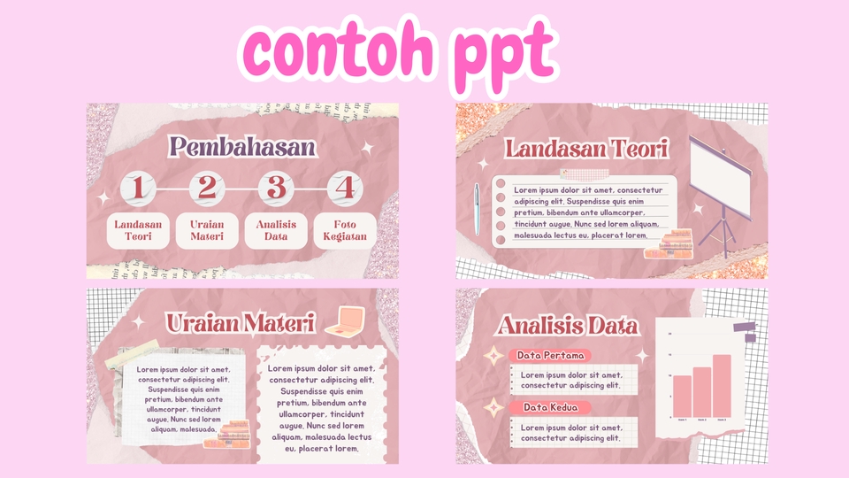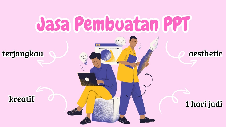 Deskripsi: jangan biarkan presentasi biasa menghambat potensi luar biasa ide-ide kamu! kami menawarkan jasa pembuatan powerpoint profesional dengan desain modern dan menarik. cocok untuk kebutuhan bisnis, akademis (tugas sekolah/kuliah), atau proyek pribadi. dapatkan slide yang tak hanya informatif tapi juga estetik, semuanya dengan harga yang pas di kantong. Langkah Pekerjaan 1. Berikut proses kerja untuk jasa pembuatan PPT: 1. **Konsultasi Awal**: Diskusikan kebutuhan dan tujuan presentasi, termasuk jumlah slide, tema, dan konten spesifik. 2. **Pengumpulan Data**: Kirimkan materi yang diperlukan seperti teks, gambar, atau data lain yang ingin dimasukkan. 3. **Desain Awal**: Kami akan membuat desain awal sesuai permintaan, termasuk layout, warna, dan font. 4. **Review dan Revisi**: Tinjau desain awal dan berikan feedback. Revisi akan dilakukan sesuai permintaan (maksimal 2 kali). 5. **Penambahan Fitur**: Tambahkan elemen seperti animasi sederhana, transisi, dan ilustrasi sesuai kebutuhan. 6. **Finalisasi**: Setelah revisi selesai dan disetujui, kami akan menyelesaikan presentasi dalam format PPT atau PDF. 7. **Pengiriman**: Kirimkan hasil akhir ke Anda dan berikan bonus slide seperti cover, thank you slide, dan alternatif slide tambahan. 8. **Dukungan Lanjutan**: Jika ada kebutuhan tambahan atau perubahan setelah pengiriman, kami siap membantu. 2. Berikut adalah contoh proses kerja jasa pembuatan PPT dalam bahasa yang lebih formal: 1. **Konsultasi Awal**: Diskusikan kebutuhan Anda, termasuk tema, jumlah slide, dan konten yang diinginkan. 2. **Pengumpulan Materi**: Kirimkan semua materi yang diperlukan, seperti teks, gambar, dan data. 3. **Desain Awal**: Kami akan membuat desain awal berdasarkan informasi yang Anda berikan, termasuk layout, warna, dan font. 4. **Review dan Revisi**: Tinjau desain awal dan sampaikan umpan balik. Revisi dapat dilakukan hingga 2 kali. 5. **Penambahan Fitur**: Kami akan menambahkan animasi, transisi, atau ilustrasi sesuai permintaan. 6. **Finalisasi**: Setelah revisi selesai dan disetujui, kami akan menyelesaikan presentasi dalam format PPT atau PDF. 7. **Pengiriman**: Hasil akhir akan dikirimkan kepada Anda, termasuk bonus slide seperti cover, thank you slide, dan alternatif slide tambahan. 8. **Dukungan Lanjutan**: Jika ada kebutuhan tambahan atau perubahan setelah pengiriman, kami siap memberikan bantuan.
