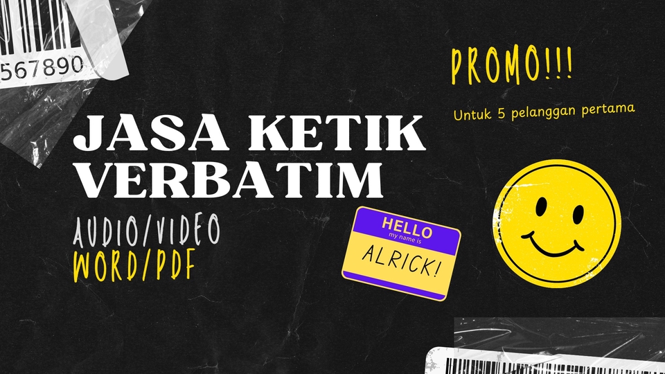 Butuh bantuan mengubah audio atau video jadi teks? Saya siap membantu! saya menawarkan jasa transkrip dengan harga terjangkau untuk segala keperluan, baik akademik maupun non-akademik. Jenis file dapat berupa audio atau video. seperti pidato, wawancara, rekaman telepon, voice note, podcast, film, dan jenis file lainnya yang mendukung audio Hasilnya dijamin rapi dan sesuai format yang Anda minta. Anda tinggal duduk santai, privasi klien serta isi wawancara terjamin aman! Langkah Pekerjaan 1. Diskusi antara seller dan klien perihal harga, durasi pengerjaan, dan durasi audio yang akan dipakai 2. Klien melakukan pembayaran dan mengirim bahan materi untuk dijadikan word atau pdf 3. Transkrip atau Ketikan dikerjakan oleh seller 4. File akhir dikirimkan ke klien 5. Proses revisi bila perlu, rating seller 6. Seller mengucapkan terimakasih