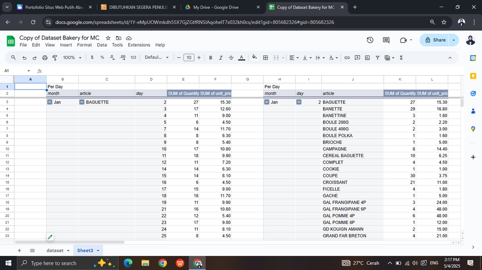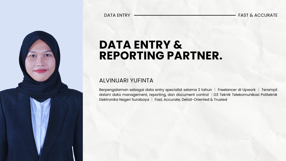 Spesialis Data Entry dan Dukungan Administratif dengan pengalaman langsung lebih dari 2 tahun. Saya telah banyak terlibat dalam pekerjaan entri data, pembuatan laporan, pengendalian dokumen, dan pengelolaan spreadsheet menggunakan Microsoft Excel dan Google Sheets. Saya pribadi yang teliti, terorganisir, dan berkomitmen untuk memberikan hasil yang akurat dan tepat waktu untuk setiap proyek. ✔ Akurasi 100% ✔ Tepat Waktu ✔ Kepuasan Klien Terjamin ✅ Berikut layanan yang saya tawarkan: - Entri Data (Excel, Google Sheets, Microsoft Word) - Konversi Dokumen PDF/Gambar ke Excel/Word - Pembersihan dan Pemformatan Data - PivotTable dan Rumus Excel (VLOOKUP, Validasi Data, dll.) - Dukungan Administratif - Pembuatan Laporan (Harian, Mingguan, Bulanan) - Pengetikan Manual / Salin-Tempel - Riset Online (Web Research) - Pengelolaan dan Pengarsipan Dokumen - Kompilasi Email dan Daftar Kontak - Entri Data Transaksi dan Invoice - Pemformatan Laporan Audit Internal - Entri Data Inventaris dan Stok - Entri Data ke dalam CRM - Input Data dari Kartu Nama ke Spreadsheet - Analisis Data Sederhana 📩 Hubungi saya hari ini — saya akan merespons dengan cepat dan siap mendukung proyek Anda secara profesional dan berdedikasi.
