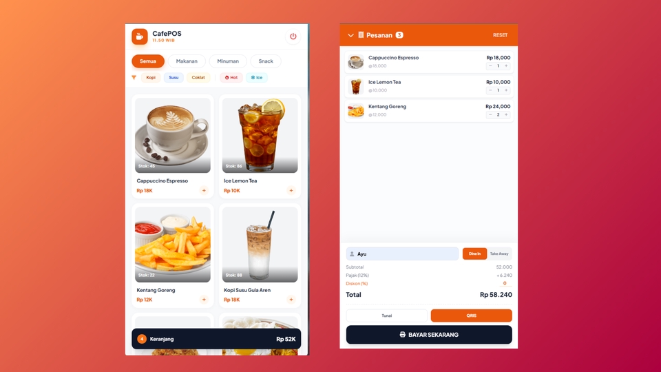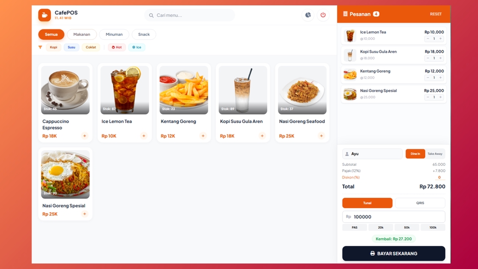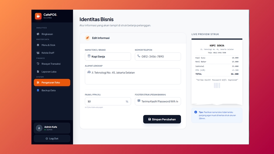 Ingin sistem kasir canggih yang bisa dipantau dari mana saja tanpa biaya langganan? CafePOS adalah solusinya! Aplikasi berbasis web yang didesain khusus untuk kecepatan operasional bisnis kuliner (Kafe, Kedai Kopi, Warung Makan). FITUR LENGKAP APLIKASI: 1. Mesin Kasir (Point of Sales): Tampilan Modern & User Friendly. Support Dine-In (Makan di tempat) & Take-Away (Bungkus). Input Nama Pelanggan. Smart Payment: Pilihan bayar Tunai atau QRIS. Hitung kembalian otomatis & Diskon manual. Struk Dinamis: Support printer thermal 58mm/80mm (Bluetooth/USB). Struk Dapur: Cetak pesanan khusus untuk Barista/Koki (tanpa harga). 2. Manajemen Produk: Kategori (Makanan, Minuman, Snack). Tag/Label Pintar: Filter menu berdasarkan tag (misal: Kopi, Dingin, Best Seller). Manajemen Stok (Otomatis berkurang saat transaksi). 3. Dashboard Admin & Laporan: Executive Dashboard: Grafik penjualan 7 hari terakhir & Indikator kenaikan omset. Peringatan Stok: Notifikasi otomatis jika bahan baku menipis. Laporan Keuangan: Rekap pendapatan harian, bisa difilter per tanggal. Backup Data: Amankan database penjualan dalam 1x klik. 4. Pengaturan Toko: Ganti Nama Toko, Alamat, No HP, dan Footer Struk sendiri lewat admin panel. Atur Persentase Pajak/PPN sesuai kebutuhan. Bisa Request Tambah fitur dan Costum desain. Contoh Hasil : pos-kasir.rf.gd