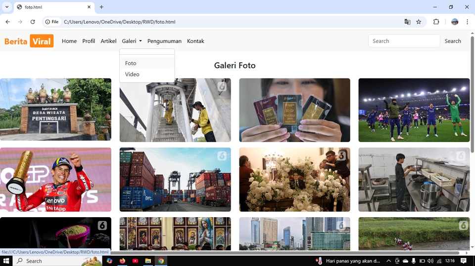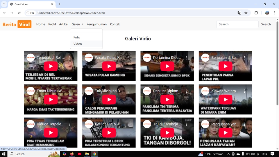 di website ini sudah ada dropdown bagian galeri, dan di bagian vidio sudah bisa menampilkan vidio dari youtube . saat mouse mengarah ke vidio vidio akan berjalan sedikit dan klik youtube itu akan mengarahkan ke youtube dan dapat di tonton full. sudah tersedia search untuk memudahkan pengguna untuk mencari berita yang ingin di cari.
