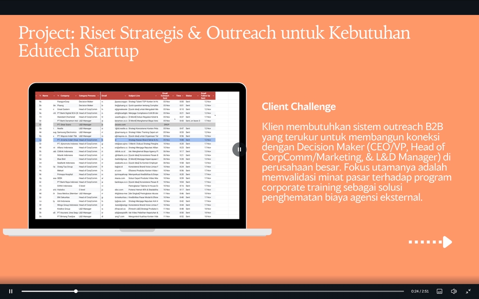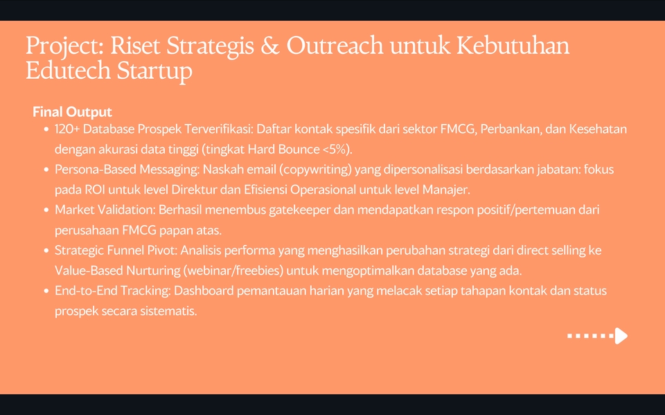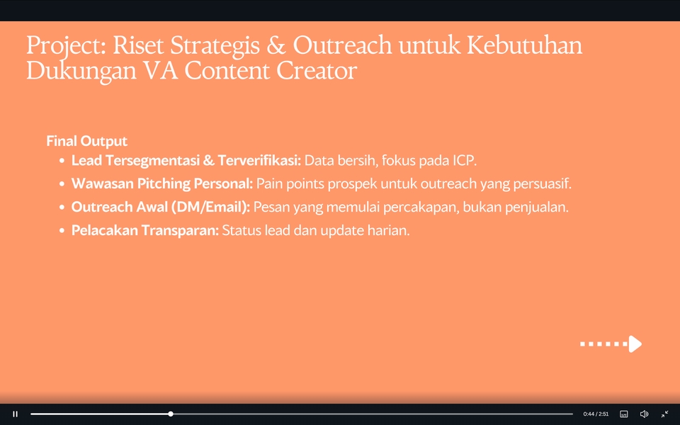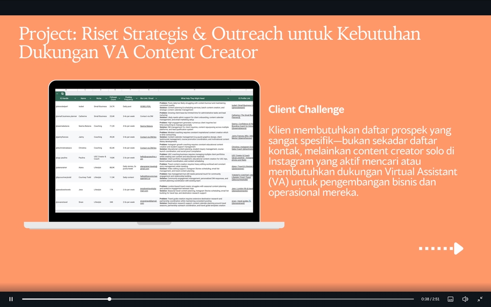 Stop buang waktu mencari prospek acak! Saya adalah Virtual Assistant (VA) strategis yang fokus pada Lead Generation dan Outreach yang qualified. Tugas saya sederhana: membuat komunikasi bisnis Anda lebih lancar, efektif, dan terarah menuju calon klien yang tepat. Layanan Kunci untuk Pertumbuhan Bisnis Anda 1. Pencarian & Data Akurat: Menemukan calon pelanggan ideal (ICP) dan menyusun daftar prospek dengan data yang valid dan terorganisir. 2. Outreach Personal & Follow-up: Menyusun konten email yang personalized dan strategi follow-up untuk menjangkau prospek di daftar Anda, memastikan pesan Anda mencapai audiens yang tepat. Proses Kerja Profesional Saya mengumpulkan data dengan memanfaatkan sumber daya profesional seperti Direktori Bisnis online (Google Maps, Yelp, Crunchbase) dan Media Sosial Profesional (LinkedIn, Instagram, Facebook). Proses ini menjamin data akurat dan siap untuk outreach. Mengapa Memilih Saya? Sebagai seorang Virtual Assistant, saya terbiasa bekerja detail, terorganisir, dan fleksibel menyesuaikan alur kerja Anda. Anda fokus mengembangkan bisnis, dan saya pastikan proses lead Anda berjalan mulus di belakang layar. Jasa belum termasuk platform fee.