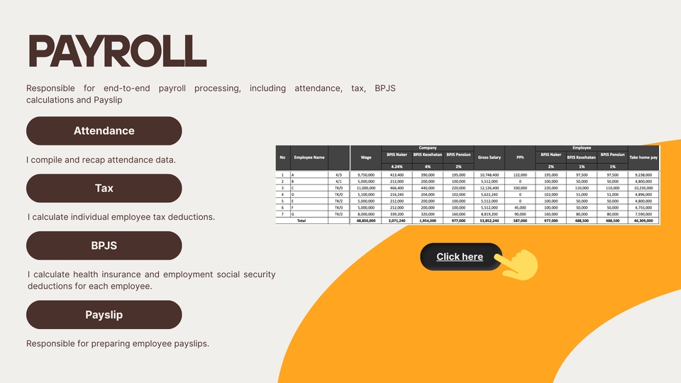 Saya akan membantu anda dalam menghitung gaji karyawan. Saya memiliki pengalaman dalam bidang payroll lebih dari 3 tahun. Saya terbiasa menghitung bpjs kesehatan, bpjs ketenagakerjaan dan pph 21. Langkah Pekerjaan 1. Klien menjelaskan proses payroll di perusahaan 2. Klien memberi data karyawan dan rincian gaji 3. Kami memulai perhitungan gaji 4. Klien menyetujui perhitungan gaji 5. Kami membuat slip gaji karyawan