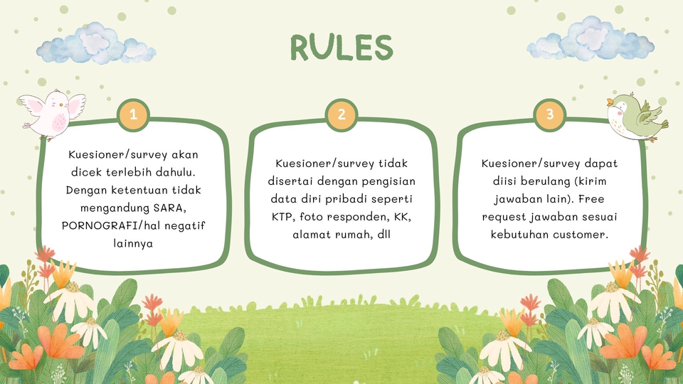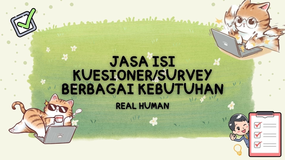 Survey numpuk bikin pusing? 🌀 Tenang, ada aku yang siap bantuin! ✨ Aku melayani jasa isi kuesioner & survey buat segala kebutuhan—mulai dari tugas kuliah, penelitian, sampai project kerjaan. Proses gampang banget, tinggal kasih link atau form, sisanya aku yang beresin. Santai aja, semua dikerjain rapi, cepat, dan sesuai request kamu. Jadi kamu bisa fokus ke hal lain tanpa drama 🚀 Langkah pengerjaan : 1. Diskusi dengan client terkait kuesioner (jenis kuesioner dan jumlah kebutuhan akun/responden) 2. Serah terima link kuesioner 3. Melakukan transaksi pembayaran 4. Mulai proses pengerjaan + update proses pengerjaan 5. Pengiriman bukti dan hasil pengerjaan