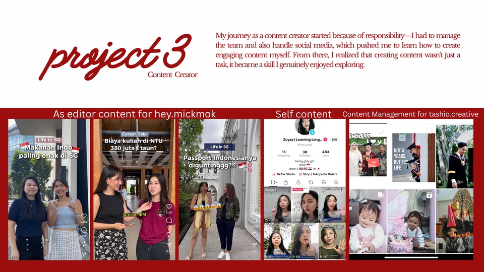 Saya membantu brand dan individu dalam menciptakan konten yang menarik dan sesuai dengan identitas merek. Layanan yang saya tawarkan meliputi: ✨ Pembuatan Konten: ide, konsep, dan copywriting untuk Instagram, TikTok, dan platform lainnya. 🎬 Manajemen Media Sosial: penjadwalan, caption writing, riset tren, dan analisis performa konten. 📸 Content Production Support: koordinasi foto/video shoot, editing ringan, dan storytelling visual. Saya telah berpengalaman mengelola konten untuk brand lokal maupun personal brand, dengan hasil yang meningkatkan engagement dan memperkuat branding. Saya terbuka untuk kerja sama jangka pendek maupun panjang, termasuk proyek freelance atau remote.