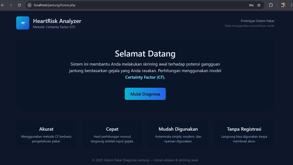 Website ini bisa berbasis Php dan menggunakan Certainty Factor, digunakan sebagai pendeteksi HeartRisk Analyzer