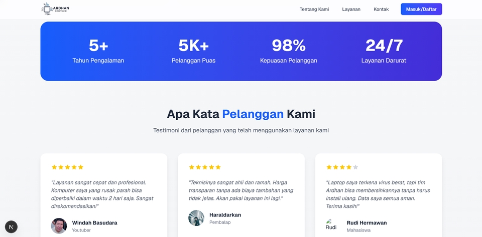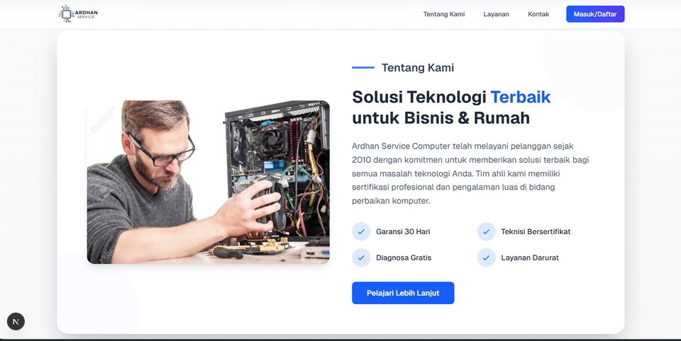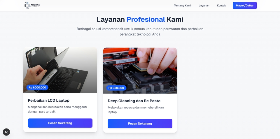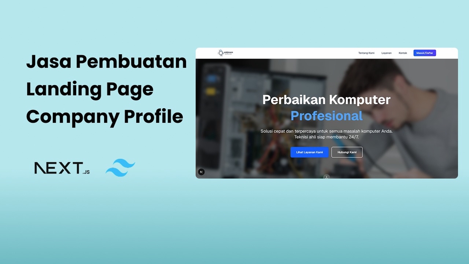 🚀 Jasa Pembuatan Landing Page & Company Profile Profesional Dengan Next.js + Tailwind CSS Hai! Saya Ardhan, freelance developer yang siap bantu kamu membangun landing page atau website company profile modern, cepat, dan responsif menggunakan Next.js dan Tailwind CSS. 🔧 Layanan yang Saya Tawarkan: ✅ Desain landing page profesional & clean ✅ Company profile yang menarik dan informatif ✅ Responsif di semua perangkat (mobile, tablet, desktop) ✅ Kode bersih & mudah dikembangkan ke depannya ✅ Integrasi form kontak, tombol WhatsApp, Google Maps, dan lainnya 💡 Cocok untuk: UMKM yang ingin tampil online secara profesional Startup dan bisnis lokal Personal branding atau portofolio Event & kampanye produk/jasa