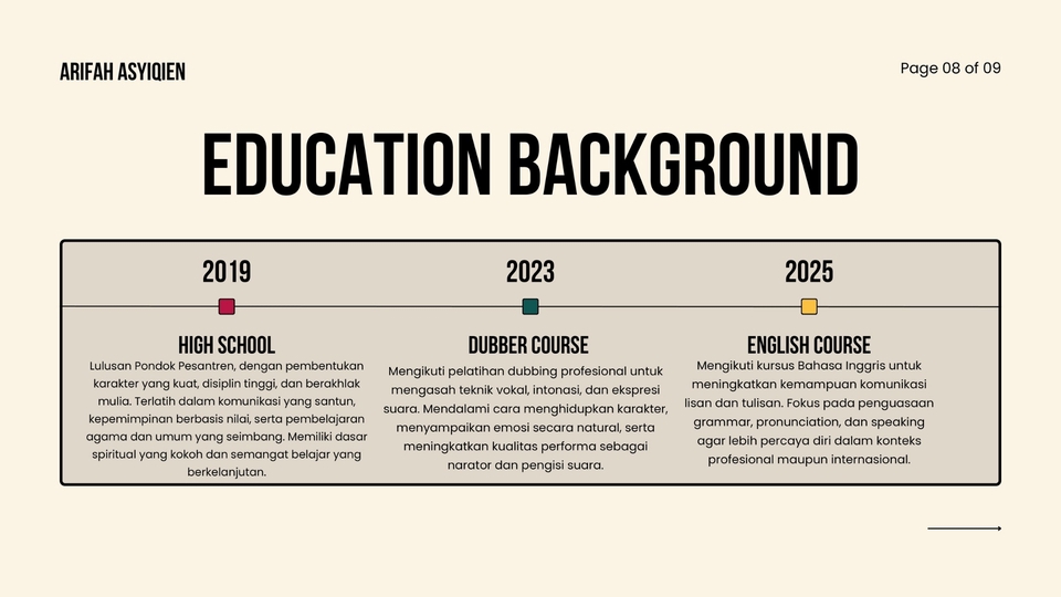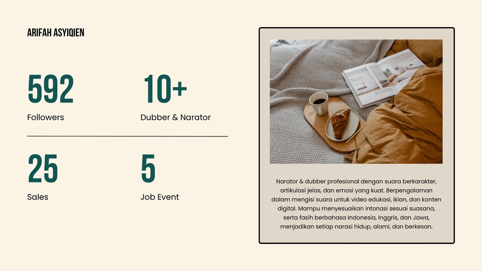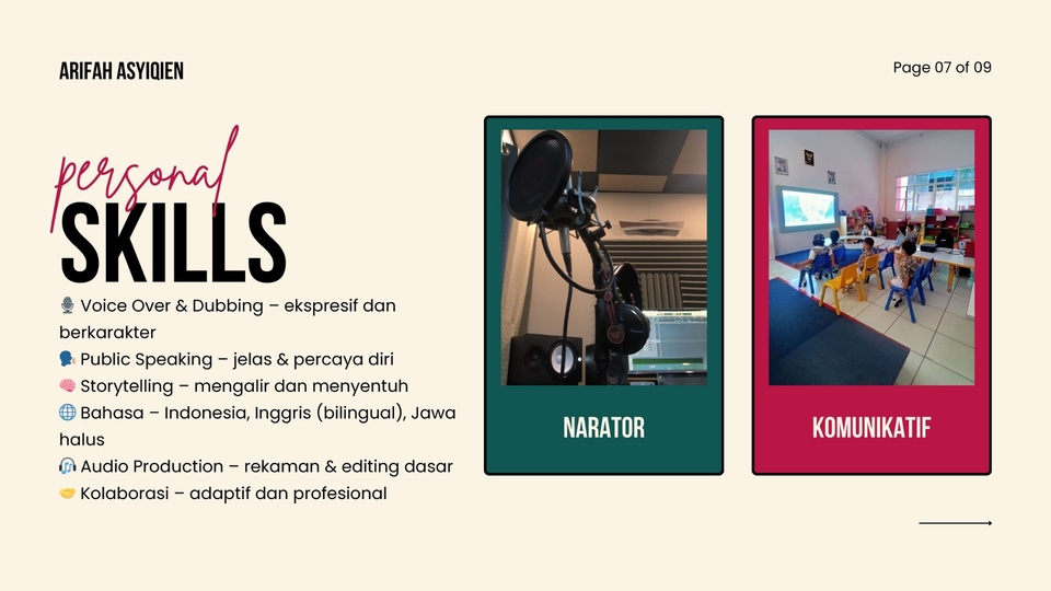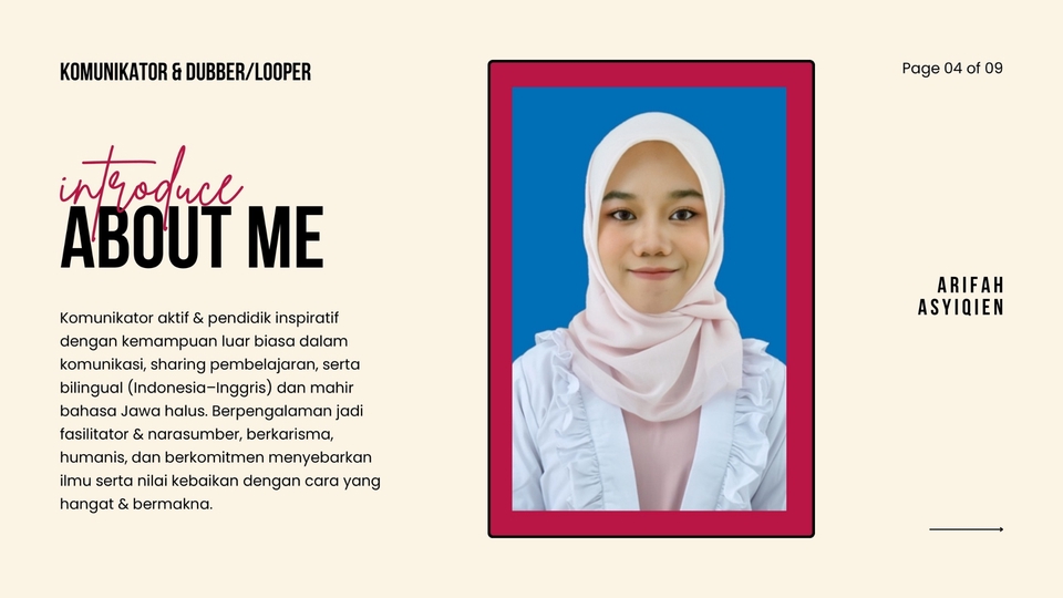 Komunikator aktif & pendidik inspiratif dengan kemampuan luar biasa dalam komunikasi, sharing pembelajaran, serta bilingual (Indonesia–Inggris) dan mahir bahasa Jawa halus. Berpengalaman jadi fasilitator & narasumber, berkarisma, humanis, dan berkomitmen menyebarkan ilmu serta nilai kebaikan dengan cara yang hangat & bermakna.