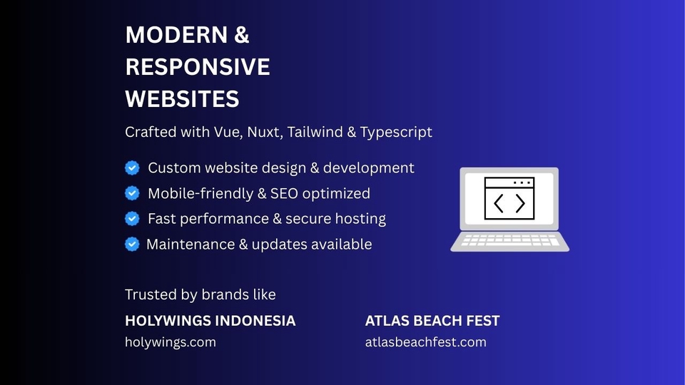 Hi! I’m Ariel, a Front-End Web Developer with professional experience building modern, responsive, and high-performance websites. I specialize in Vue.js, Nuxt.js, Tailwind CSS, and TypeScript, and I’ve developed websites for well-known brands such as Holywings Indonesia and Atlas Beach Fest. What I can do for you: - Build or redesign responsive websites with clean, modern UI - Optimize performance, SEO, and mobile experience - Develop reusable components for scalability - Maintain and improve existing websites - Deploy and ensure your site is secure and reliable 💻 Tech Stack: Vue 3, Nuxt 3, Tailwind CSS, TypeScript (also accepts vanilla HTML CSS Javascript) 🌍 Portfolio: holywings.com, atlasbeachfest.com, hss.hwgroup.id. and many more