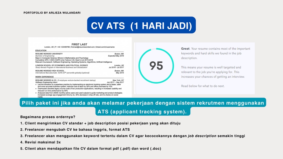 Rp100,0 rbPilih paket ini jika anda akan melamar pekerjaan dengan sistem rekrutmen menggunakan ATS (Applicant Tracking System). Bagaimana prosesnya? 1. Client mengirimkan CV standar + job description posisi pekerjaan yang akan dituju 2. Freelancer mengubah CV ke bahasa inggris, format ATS 3. Freelancer akan menggunakan keyword tertentu dalam CV agar kecocokannya dengan job description semakin tinggi 4. Revisi maksimal 3x 5. Client akan mendapatkan file CV dalam format PDF (.pdf) dan WORD (.doc)