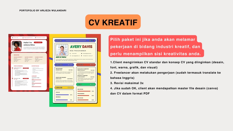 Rp100,0 rbPilih paket ini jika anda akan melamar pekerjaan di bidang industri kreatif, dan perlu menampilkan sisi kreativitas anda. Bagaimana prosesnya? 1. Client mengirimkan CV standar dan konsep CV yang diinginkan (desain, font, warna, grafik, dan visual) 2. Freelancer akan melakukan pengerjaan (sudah termasuk translate ke bahasa Inggris) 3. Revisi maksimal 3x 4. Jika sudah OK, client akan mendapatkan master file desain (canva) dan CV dalam format PDF
