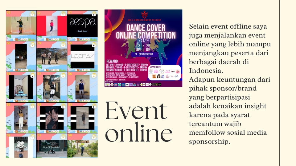 Rp7,5 jtEvent berkapasitas sedang dan effort sedang dengan opsi - Online competition dengan promosi product di tiap video peserta (insight kunjungan, followers, promosi, konten) - Busking Dance in public promosi prodict di lapangan dan sosial media dengan melakukan GA dan sejenjsnya (insight kunjungan, followers, promosi online/offline, konten)