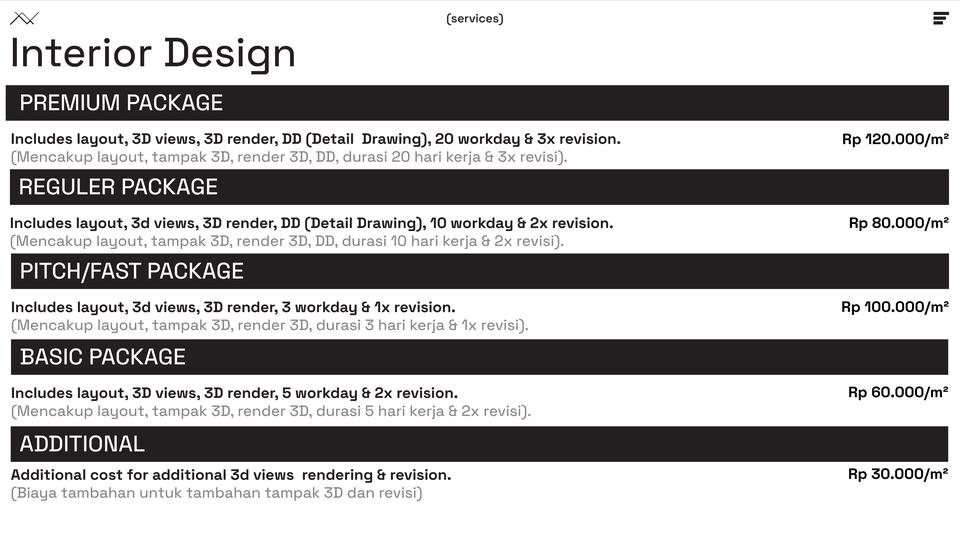 Rp250,0 rb- Layout + Konsep Desain - Moodboard (tema, warna, material utama) - 3D Model & Render - 1x revisi - Harga : Rp. 100.000 /m2 Cocok untuk klien yang ingin desain yang cepat, silahkan didiskusikan.