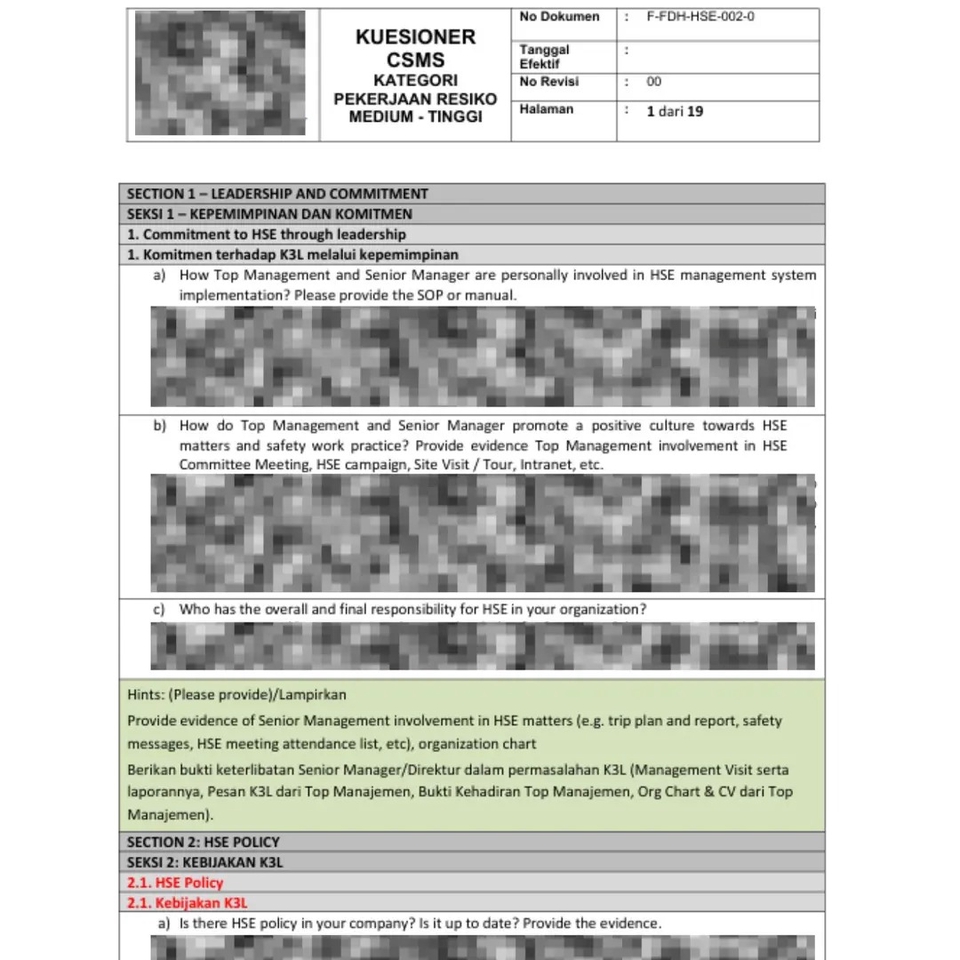- • CSMS lengkap semua bab (Profile HSE, Risiko Pekerjaan, Pengendalian, dll.)