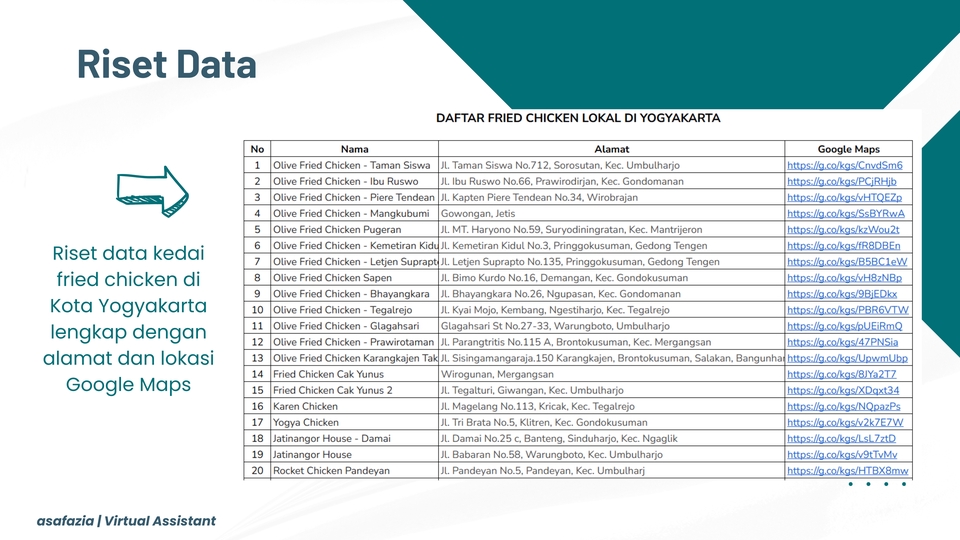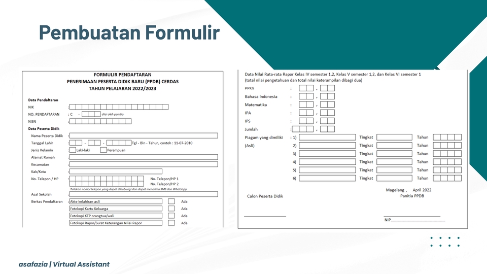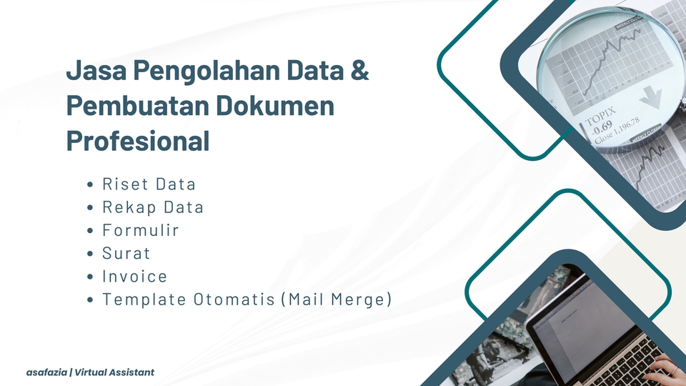 Saya menawarkan jasa Virtual Assistant pada bidang pengolahan data dan pembuatan dokumen. Dengan kemampuan mengelola data dan dokumen yang baik, saya memberikan jaminan sebagai berikut : • Pengerjaan cepat dan tepat waktu • Detail dan teliti dalam setiap pekerjaan • Kualitas pekerjaan bagus dan rapi • Kerahasiaan data terjamin Berikut layanan yang saya tawarkan : • Riset data lengkap sesuai kebutuhan • Rekap data dalam format Word, Excel atau Spreadsheet • Pembuatan invoice dan dokumen massal • Pembuatan surat resmi, undangan atau dokumen pribadi • Pembuatan template otomatis menggunakan Mail Merge Saya menerima request pekerjaan sesuai kebutuhan Anda. Silahkan chat untuk berdiskusi lebih lanjut. Langkah Pekerjaan 1. Klien menjelaskan detail pekerjaan dan mengirim data yang akan di olah 2. Diskusi mengenai durasi pengerjaan dan biaya 3. Proses pengerjaan 4. Pengiriman hasil pekerjaan 5. Revisi jika diperlukan 6. Pekerjaan selesai dan pemberian review