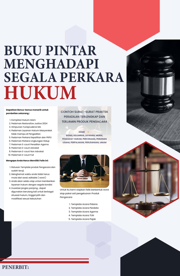 Template kami berisi faile word Hukum Pidana, Hukum Perdata, Hukum Administrasi Negara, Bisnis dan Perusahaan, Kepailitan, Hukum Perpajakan, Hukum Perburuhan dan Ketenaga Kerjaan, Perkawinan dan Perceraian, Keluarga dan Warisan, Hak dan Kekayaan Intelektual, Hukum Pertanahan dan Real Estate. Langkah Pekerjaan 1. Faile langsung kami kirim melalui email 2. Faile langsung kami kirim jika sudah terbayarkan