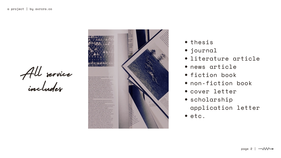 Layanan proofreading naskah skripsi, jurnal, cover letter, motivation letter, CV, essai, artikel ilmiah, maupun naskah fiksi berupa novel, cerpen, dan lain-lain. Tidak hanya memastikan di dalam tulisan tidak terdapat salah ketik (proofreading) namun juga merevisi (editing) pemilihan diksi untuk memaksimalkan kohesi dan koherensi dengan tetap mempertimbangkan konteks serta konsep tulisan. Membantu memperbaiki naskah / tulisan sehingga terbebas dari plagiasi melalui metode paraphrasing. Pekerjaan diselesaikan secara profesional berdasarkan pengalaman proofreading di sebuah lembaga penerbitan indie. Naskah termasuk surat lamaran kerja, surat pendaftaran sekolah/kuliah/beasiswa, buku, disertasi, artikel berita, dan lain sebagainya. Langkah Pekerjaan 1. Client memilih paket sesuai kebutuhan 2. Diskusi bersama freelancer terkait detail naskah, disusul durasi dan biaya 3. Client melakukan pembayaran 4. Pengerjaan berdasarkan kesepekatan; termasuk garansi