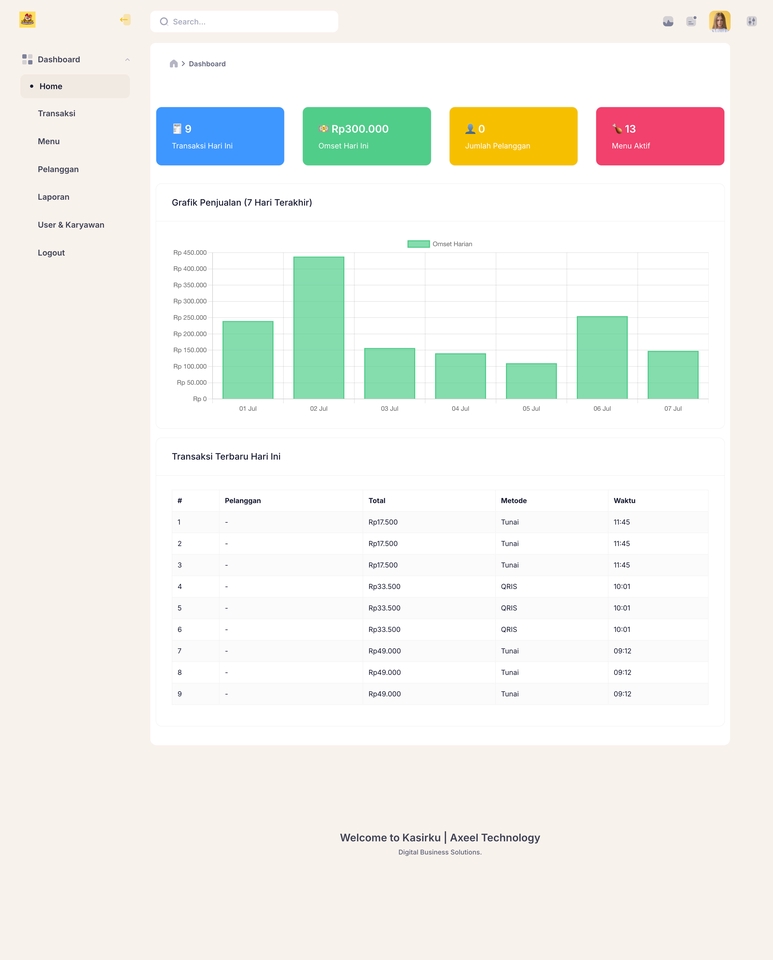 ✅ DAFTAR FITUR SISTEM E-Commerce & Compro – AXEEL TECHNOLOGY (Yii2) ✅ Skalabel ke fitur keuangan, stok, reservasi, dan lainnyaasir, owner Fitur login & logout aman Menu sidebar dinamis berdasarkan role Profil pengguna: Nama lengkap, username, no HP, alamat, jenis kelamin Upload & update foto profil Ganti password dengan validasi Role-based access control: Kasir hanya akses Dashboard & Transaksi Admin/Owner akses semua modul 2. Transaksi Kasir Modern Tampilan POS (Point of Sale) responsif Katalog menu dalam kartu bergambar + filter kategori (makanan/minuman) Pencarian menu berdasarkan nama & saus Keranjang pintar: Tambah otomatis Hitung total realtime Hapus item Pelanggan fleksibel: Umum (tanpa simpan) Pilih Member (dropdown + search) Tambah Member Baru otomatis Metode pembayaran: Tunai, QRIS, Debit Setelah transaksi: Simpan ke database (`transaksi` & `transaksi_detail`) Cetak otomatis ke printer thermal Struk ditutup otomatis Notifikasi sukses dikirim ke tab utama 3. Struk Otomatis (Thermal 58mm) Format disesuaikan untuk printer kasir Tampilkan: Judul toko, alamat Tanggal, No Transaksi Nama kasir, detail belanja, total Metode bayar dan ucapan penutup Auto print & auto close tab + notifikasi selesai 4. Manajemen Menu CRUD Menu: Nama, harga, saus, kategori, status, gambar Upload gambar thumbnail GridView menu lengkap dengan preview gambar 5. Manajemen Pelanggan CRUD Pelanggan (nama, kontak) Digunakan di transaksi Pelanggan baru disimpan otomatis saat transaksi 6. Manajemen User/Karyawan CRUD User (admin, kasir, owner) Tambahan: Shift kerja Status aktif/tidak Device ID Nama lengkap, no HP, alamat, jenis kelamin Foto profil Ganti password & edit profil 7. Dashboard & Laporan Ringkasan transaksi Grafik Chart.js (pengganti FlotChart) Rekap akan disusun per hari/bulan --- 8. Notifikasi Reaktif (Ajax) Badge / alert dinamis tanpa reload Siap dikembangkan jadi notifikasi shift, stok, antrian, dll --- 9. Tampilan Mode Gelap & Terang (Dark/Light Mode) Dukungan switch tema: Mode terang (light) default Mode gelap (dark) untuk kenyamanan malam Disimpan di browser (localStorage) Antarmuka tetap elegan & modern --- 💡 KELEBIHAN SISTEM ✅ UI modern (Bootstrap 5 + Saul UI) ✅ Akses role-based aman ✅ Tampilan POS cepat & ramah touchscreen ✅ Cetak struk otomatis + thermal 58mm ✅ Mode Dark & Light ✅ Support pelanggan member ✅ Siap integrasi laporan & ekspor PDF/Excel ✅ Skalabel ke fitur keuangan, stok, reservasi, dan lainnya