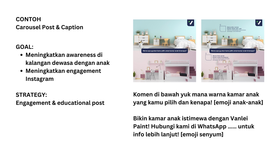 Berpengalaman 5 tahun dalam Digital Marketing, saya dapat membantu Anda mengembangkan bisnis Anda dengan memberikan strategi untuk media sosial Anda, rencana konten bulanan, hingga pengerjaan creative untuk media sosial Anda beserta caption. Langkah Kerja: 1. Client memberikan informasi seputar bisnis, target market, dan brief lainnya 2. Freelancer memberikan rancangan awal strategi 3. Client memberikan feedback dan revisi 4. Freelancer memberikan kalendar konten 5. Client memberikan feedback dan revisi 6. Freelancer memberikan design post beserta caption media sosial 7. Client memberikan feedback dan revisi 8. Freelancer memberikan pekerjaan akhir Langkah Pekerjaan 1. Client memberikan goal dan brief 2. Freelancer membuat strategy atau kalendar konten 3. Client memberikan feedback dan revisi 4. Proses pengerjaan desain dan revisi 5. Freelancer memberikan caption 6. Client memberikan feedback dan revisi 7. Freelancer memberi pekerjaan akhir