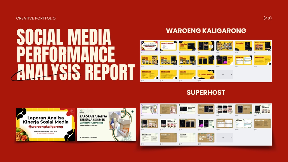 Hallo, saya merupakan Digital Marketer/Content Creator yang telah berpengalaman selama lebih dari 2 tahun dalam pengelolaan sosial media perusahaan. Saya telah dipercaya untuk mengelola 4 akun sosial media perusahaan dalam bidang F&B & property. Berhasil meningkatkan penjualan 3 merek restoran dengan total 7 cabang hingga 60%, berhasil menjual habis 27 kamar kost dalam waktu 4 hari serta menjual unit apartemen serta penginapan harian kepada lebih dari 75 tamu (terus bertambah) melalui pengembangan konten kreatif yang tepat sasaran, menarik & mengikuti trend terkini. Saya bisa membantumu para bussiness owner, brand, perusahaan, instansi, UMKM/lainnya dalam pengelolaan sosial media meliputi pembuatan content plan, content writing, copywriting, caption & content marketing yang sesuai dengan kebutuhanmu.