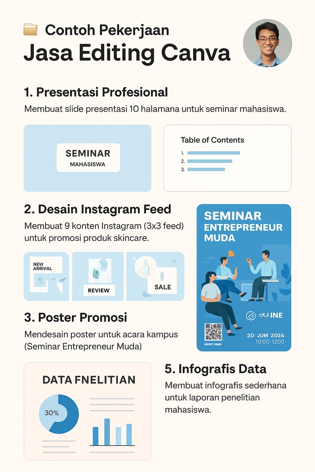 Jasa pengeditan Canva adalah layanan desain menggunakan platform Canva untuk membuat atau mengedit berbagai kebutuhan visual seperti presentasi, poster, banner, feed Instagram, kartu nama, hingga materi promosi dengan cepat, rapi, dan sesuai permintaan klien. Layanan ini cocok bagi individu, UMKM, maupun perusahaan yang ingin mendapatkan desain menarik tanpa repot, karena hasil bisa disesuaikan dengan warna brand, gaya visual, serta kebutuhan spesifik sehingga siap dipakai untuk cetak maupun digital