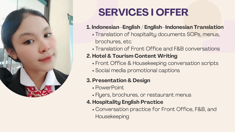 I offer services as an Indonesian-English and English-Indonesian translator, creating hotel SOPs, creating flyers, brochures, restaurant menus, creating unique caption ideas for hotel promotions on social media and offering PowerPoint and Canva creation services.
