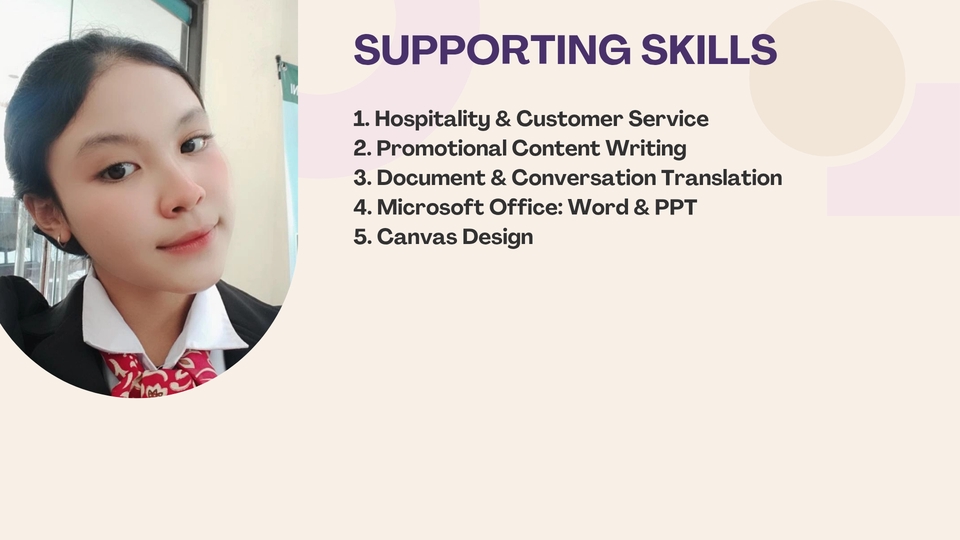 Supporting Skills 1. Hospitality & Customer Service 2. Promotional Content Writing 3. Document & Conversation Translation 4. Microsoft Office: Word & PPT 5. Canvas Design