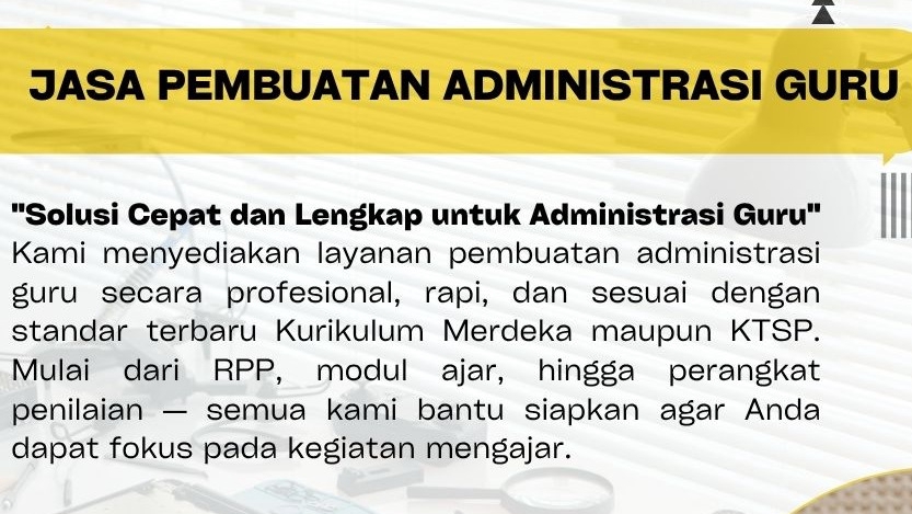 "Solusi Cepat dan Lengkap untuk Administrasi Guru" Kami menyediakan layanan pembuatan administrasi guru secara profesional, rapi, dan sesuai dengan standar terbaru Kurikulum Merdeka maupun KTSP. Mulai dari RPP, modul ajar, hingga perangkat penilaian — semua kami bantu siapkan agar Anda dapat fokus pada kegiatan mengajar. 📚 "Fokus Mengajar, Administrasi Biar Kami yang Urus!" Jadilah guru inspiratif tanpa repot menyusun tumpukan dokumen! Kami hadir sebagai solusi praktis untuk membantu Anda menyiapkan seluruh administrasi pembelajaran dengan cepat, lengkap, dan sesuai standar Kurikulum Merdeka maupun KTSP. 💡 Dengan layanan kami, Anda akan mendapatkan: ✅ Administrasi Lengkap – RPP, Modul Ajar, Prota, Promes, Silabus, Jurnal, Penilaian, hingga Laporan Harian. ✅ Desain Rapi & Profesional – Disusun dengan format terbaru dan mudah disesuaikan kebutuhan sekolah. ✅ Cepat & Tepat Waktu – Dikerjakan oleh tim berpengalaman yang paham dunia pendidikan. ✅ Bisa Custom Sesuai Mapel & Jenjang – SD, SMP, SMA, hingga SMK. ✨ Mengapa Memilih Kami? Karena kami tahu waktu Anda berharga. Kami bantu wujudkan administrasi yang lengkap, rapi, dan siap pakai, sehingga Anda bisa lebih fokus pada hal yang terpenting: mendidik dan menginspirasi siswa.