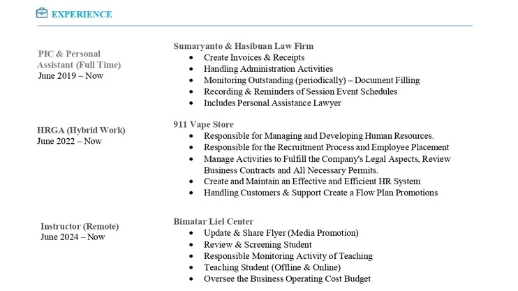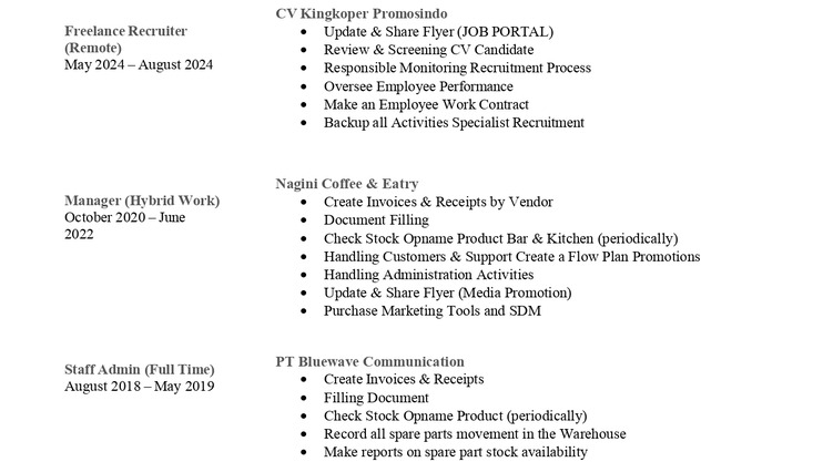 Saya menyediakan layanan Admin & HRD secara remote untuk membantu bisnis Anda tetap berjalan efisien tanpa perlu merekrut staf tetap. Layanan Admin: Input & rekap data ke sistem atau spreadsheet Pengelolaan dokumen & arsip digital Penjadwalan meeting, event, atau pengingat Pengelolaan email, invoice, dan laporan sederhana Layanan HRD: Rekrutmen & onboarding karyawan baru Pengelolaan absensi & payroll bulanan Penyusunan SOP & kontrak kerja Konsultasi pengembangan SDM dan manajemen tim Keunggulan Layanan: 100% dikerjakan secara remote, fleksibel, dan hemat biaya Komunikasi cepat via chat, email, atau video call Hasil kerja rapi, tepat waktu, dan profesional Cocok untuk: UKM, startup, bisnis online, atau perusahaan yang ingin menghemat biaya operasional namun tetap mendapatkan dukungan administrasi & HRD yang andal.