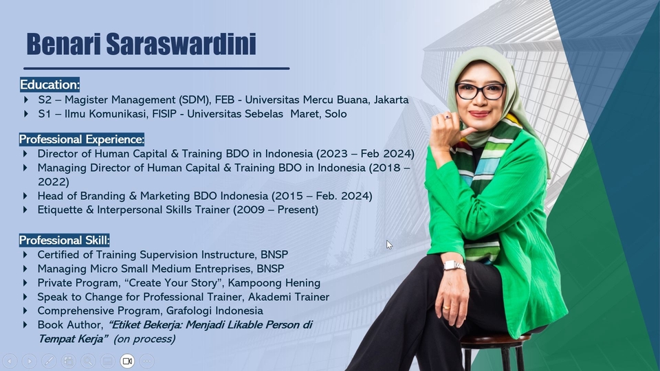 Saya adalah seorang Professional Trainer yang sudah berpengalaman lebih dari 15 Tahun, dengan latar belakang pendidikan, S2 – MM (SDM), Di Universitas Mercu Buana, Jakarta dan S1 – Ilmu Komunikasi, FISIP - UNS, Solo. Pengalaman profesi yang mendukung adalah sebagai Direktur of Human Capital & Training, selama 5 tahun dan Head of Branding & Marketing selama 13 tahun di BDO Indonesia. Saya juga memiliki beberapa sertifikasi yang mendukung yaitu sertifikasi trainer dari BNSP, mengikuti program Professional Trainer di Akademi Trainer, dan sertifikasi Grafologi. Saat ini saya juga sedang menulis buku mengenai "Etiket Bekerja", agar bisa memberikan inspirasi dan motivasi sebagai seorang professional trainer. Langkah Pekerjaan 1. Training Needs Analysis (TNA) 2. Membuat Proposal sesuai hasil TNA 3. Menyusun Materi 4. Pelaksanaan Training 5. Evaluasi (Feedback)