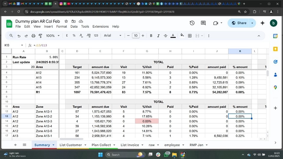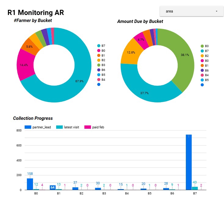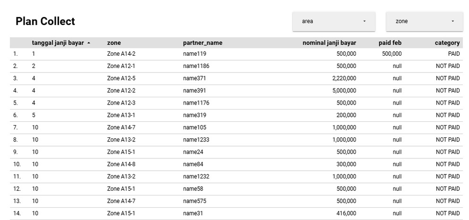 Berdasarkan list customer yang diberikan sesuai dengan masing-masing Zone, dapat dimonitor customer yang sudah di-approach dan customer yang berhasil melakukan pembayaran atau transaksi. Terdapat pula Summary untuk dapat me-monitor produktivitas setiap Zone apakah jumlah customer yang diapproach sudah lebih dari atau sama dengan run rate pada bulan tersebut. Langkah Pekerjaan 1. Menentukan list customer dan prioritas 2. Menentukan coverage manpower 3. Mengidentifikasi raw data yang dapat digunakan yang terdiri atas data visit manpower dan hasil visit 4. Join data list customer dengan data visit 5. Cleansing Data 6. Membuat summary data hasil visit 7. Membuat visualisasi jika diperlukan