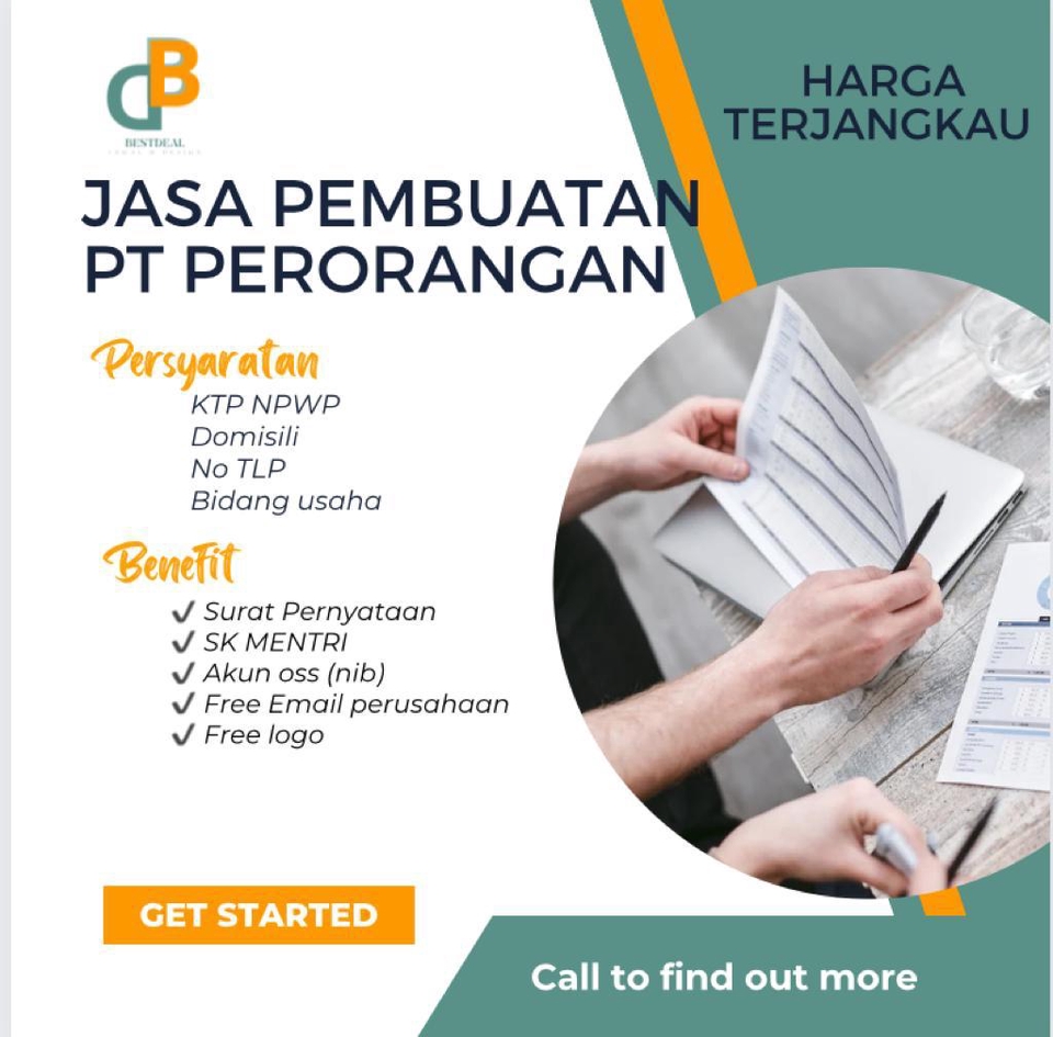 Dengan bangga kami Bestdeal.id menawarkan jasa penerbitan PT perorangan untuk membantu Anda dalam proses mendirikan perusahaan yang sah. Kami memiliki tim ahli yang siap membimbing Anda melalui seluruh proses penerbitan PT, mulai dari pengurusan dokumen hingga perizinan yang diperlukan. Dengan pengalaman kami yang luas, kami akan memastikan bahwa PT Anda didirikan dengan lancar dan sesuai dengan semua peraturan yang berlaku. Percayakan kepada kami untuk membantu Anda mencapai tujuan bisnis Anda. Hubungi kami sekarang untuk konsultasi gratis. Langkah Pekerjaan 1. Konsultas bidang usaha sesuai KBLI 2020 2. kirim dokumen KTP , NPWP ,bidang usaha dan No telephone 3. Proses pengerjaan (1 Hari setelah dokumen lengkap) 4. Kirim dokumen ke custumer