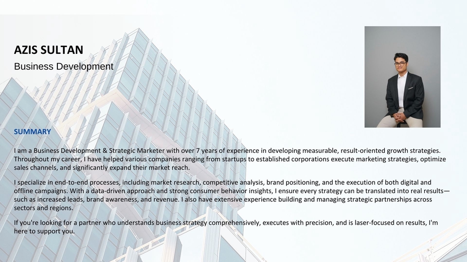 Saya adalah Business Development Specialist dengan keahlian dalam strategi pasar, market entry, analisis kompetitor, dan pengembangan kemitraan. Berpengalaman di proyek B2B & B2G, serta mampu mengintegrasikan strategi digital termasuk web development untuk mendukung pertumbuhan bisnis.