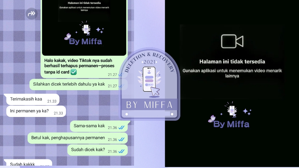 Selamat datang di By Miffa– solusi terpercaya untuk Anda yang ingin menghapus video atau konten Tiktok secara permanen. Dengan pengalaman +3 tahun dalam layanan penghapusan akun dan jejak digital, saya siap membantu Anda dengan proses yang mudah dan aman. Privasi Anda adalah prioritas utama saya ^^. Mengapa memilih By Miffa? • Proses legal • Aman dan terjamin • Tanpa login/email/password • Admin ramah & responsif