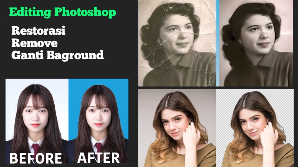 Rp35,0 rbpaket ini memperoleh restorasi foto jadul yang buram menjadi lebih HD dalam bentuk JPG, PNG Dan fotmat high kualitas