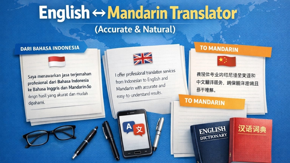 I provide professional English ↔ Mandarin translation services with accurate, natural, and easy-to-understand results. My translations are manually done (not machine translation) and adjusted to sound natural for native readers. 🔹 What I Offer: English ↔ Mandarin translation Indonesian → English Indonesian → Mandarin Clear, natural, and context-appropriate translation Proofreading before delivery 🔹 Types of Content I Can Translate: Documents & PDFs Assignments & academic texts Articles & essays Business documents Emails & general texts 🔹 Why Choose Me: Accurate & natural translation Fast response & on-time delivery Friendly communication Free minor revisions 🔹 File Formats: Word (DOC/DOCX) PDF Text files ⚠️ Please contact me before ordering for large or urgent projects.