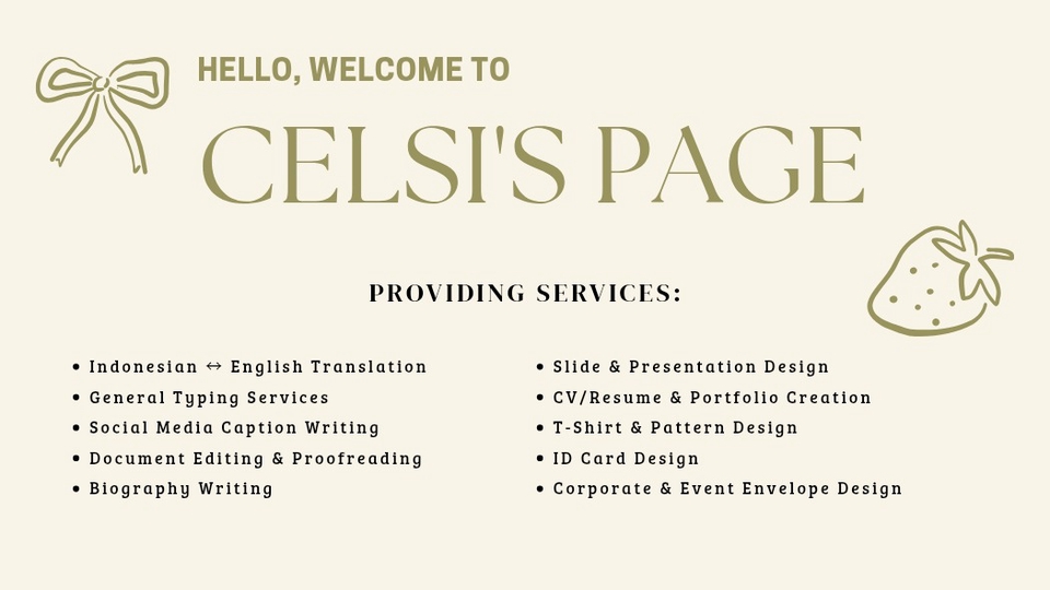 Saya menyediakan jasa penerjemahan Bahasa Indonesia ↔ Inggris dengan hasil yang akurat, natural, dan mudah dipahami. Sebagai mahasiswa Sastra Inggris di Universitas Brawijaya, saya memiliki pemahaman yang baik terhadap tata bahasa, struktur kalimat, serta nuansa bahasa sehingga terjemahan tetap sesuai konteks dan tujuan penulisan. Saya mampu menerjemahkan berbagai jenis teks seperti artikel, tugas akademik, esai, deskripsi produk, hingga dokumen umum dengan pengerjaan yang teliti, rapi, dan tepat waktu. Untuk detail lebih lanjut, silakan hubungi saya. English version: I provide Indonesian ↔ English translation services with accurate, natural, and context-appropriate results. As an English Literature student at Universitas Brawijaya, I have a strong understanding of grammar, sentence structure, and language nuances to ensure each translation aligns with its purpose and context. I am capable of translating various types of texts, including articles, academic assignments, essays, product descriptions, and general documents with careful attention to detail and on-time delivery. For further details, please feel free to contact me.