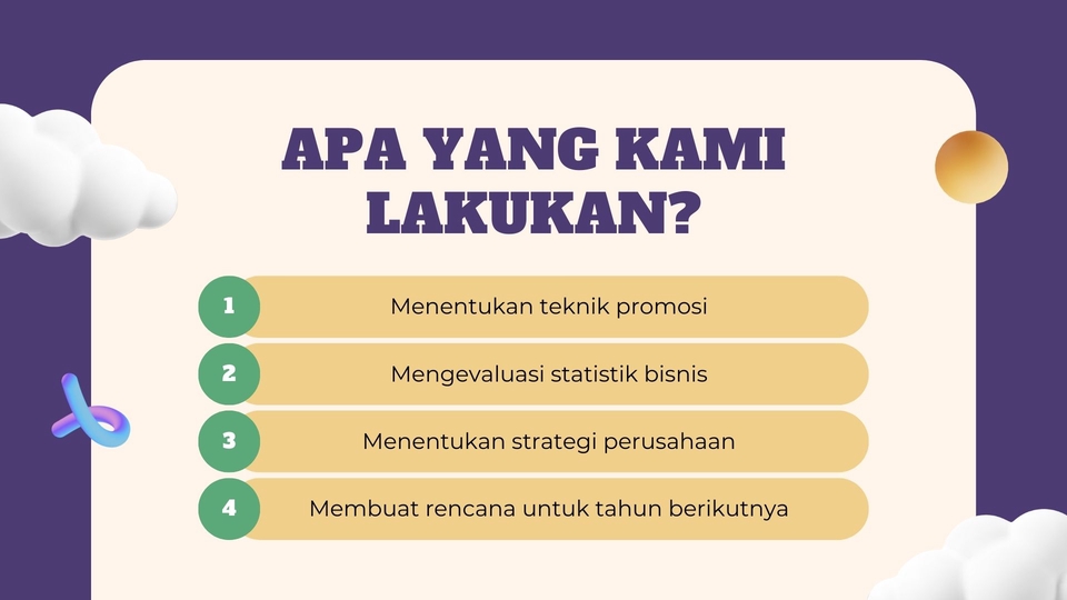 1. Bantuan konsultasi bisnis 2. Merancang atau mengembangkan strategi bisnis sesuai tujuan yang ingin dicapai. 3. Manajemen Program, Operasional, dan Pengembangan Digital (Desain, Website, Sosial Media) 4. Dengan pengalaman luas, kami membantu meningkatkan efisiensi dan optimalisasi proses bisnis sesuai waktu yang ditetapkan. 5. Hubungi kami untuk diskusi lebih lanjut dan penyesuaian kebutuhan Anda.